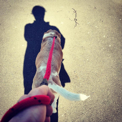 As part of the practice based element of my PhD thesis, Deep Canine Topography, this practice based investigation of the performance of human-canine hybrid aesthetic walking practices, focuses on the rhythm and repetition of the urban walkies through Henri Lefebvre's Rhythmanalysis. Using sound, photography and GPS to document the daily repetitive morning walk, in urban Leicester, this presentation explores two such walks, one taken in January 2020, the other in March 2020, during the Covid 19 lockdown period. Both walks follow the same circular route. Both attend to the rhythms of the human-canine bodies, traffic, human conversation and canine olfactory signs and signifiers, exploring harmony and disharmony between the linear rhythms of production and more messy rhythms of nature. Binaural microphones are positioned close to the canine body to capture a soundscape from the canine perspective. Duration of both walks is around 13 minutes. Headphones are advised for a full spatial experience.