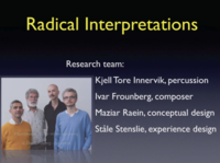 Participants: percussionist Kjell Tore Innervik, Norwegian Academy of Music (NMH), composer Ivar Frounberg, NMH, designer Maziar Raein, Oslo National Academy of the Arts, experience designer Ståle Stenslie, The Oslo School of Architecture and Design, and music recording producer Morten Lindberg.