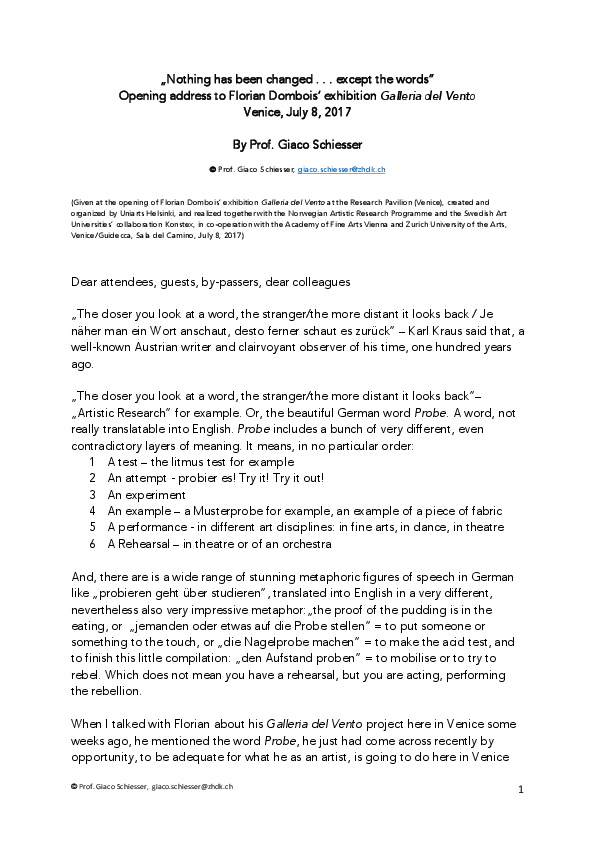 Florian Dombois' research project "Galleria del Vento" - started July 8, 2017 and will run till August 13, 2017. It is the contribution of Zurich University of the Arts (ZHdK) to this year's Research Pavilion in Sala del Camino, Venice.
