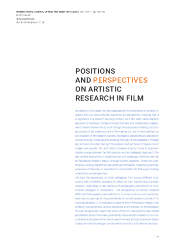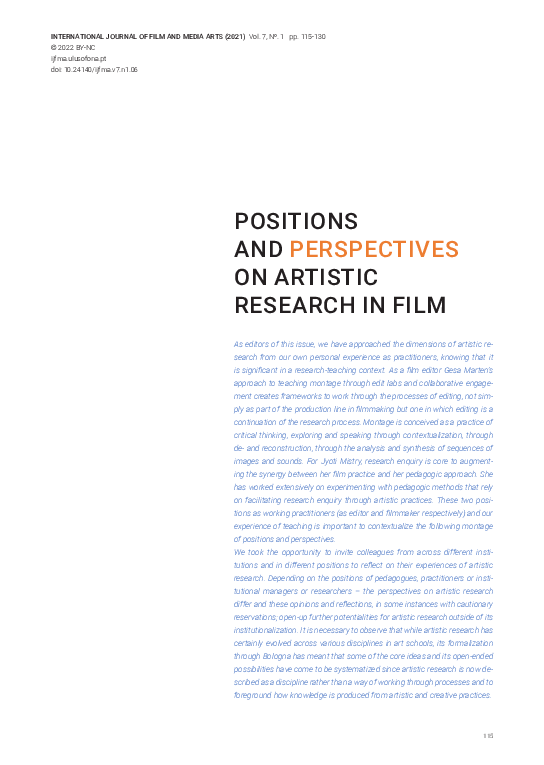 As editors of this issue, we have approached the dimensions of artistic research from our own personal experience as practitioners, knowing that it is significant in a research-teaching context. As a film editor Gesa Marten’s approach to teaching montage through edit labs and collaborative engagement creates frameworks to work through the processes of editing, not simply as part of the production line in filmmaking but one in which editing is a continuation of the research process. Montage is conceived as a practice of critical thinking, exploring and speaking through contextualization, through de- and reconstruction, through the analysis and synthesis of sequences of images and sounds. For Jyoti Mistry, research enquiry is core to augmenting the synergy between her film practice and her pedagogic approach. She has worked extensively on experimenting with pedagogic methods that rely on facilitating research enquiry through artistic practices. These two positions as working practitioners (as editor and filmmaker respectively) and our experience of teaching is important to contextualize the following montage of positions and perspectives.