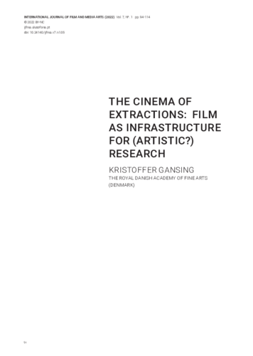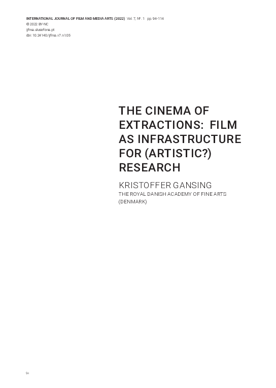 In contemporary discussions of film and artistic research, the historical undercurrent of film as an intense research and development activity, does not seem to be widely discussed. In contrast, film history and media archaeology has since long re-evaluated the status of early moving image technologies, which do not any longer denote pre-cinematic curiosities that simply predate the institution of cinema and its narrative forms but is rather seen as containing socio-technical trajectories and aesthetic regimes that can be studied in their own right. This essay performs a further modulation of the legacies of film history, one in which moving image technology is not seen as primarily a vehicle for film as cinema, but a continuously evolving technological and aesthetic infrastructure for film as research. This then becomes the starting point from which to reflect on artistic research in film, which today is being institutionalized as a form of practice-based research, arguably with the risk of loosing sight of an already long-established tradition of film, not only as research but also as artistic research. With the aid of an accompanying desktop video essay, the article speculates on the changing contexts of film as research visà-vis film as artistic research, from early cinema and its connection to scientific discoveries and the advanced data-analysis of today’s streaming platforms. Inspired by “The New Film History” and Tom Gunning’s influential notion of “The Cinema of Attractions” which revised the view on early cinema and the development of a filmic avant-garde, the presentation eventually focuses on artistic responses to the contemporary “Cinema of Extractions”, as a datafied infrastructure that now conditions what is knowable and sayable through the moving image.
