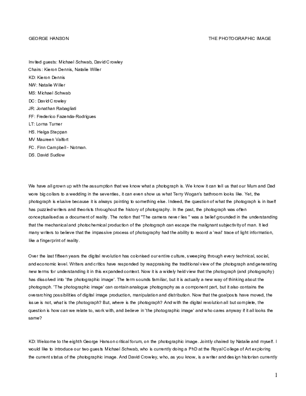 The Photographic Image. George Hanson Critical Forum. Preprint