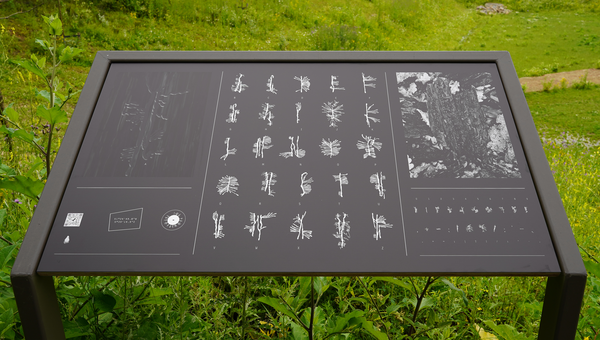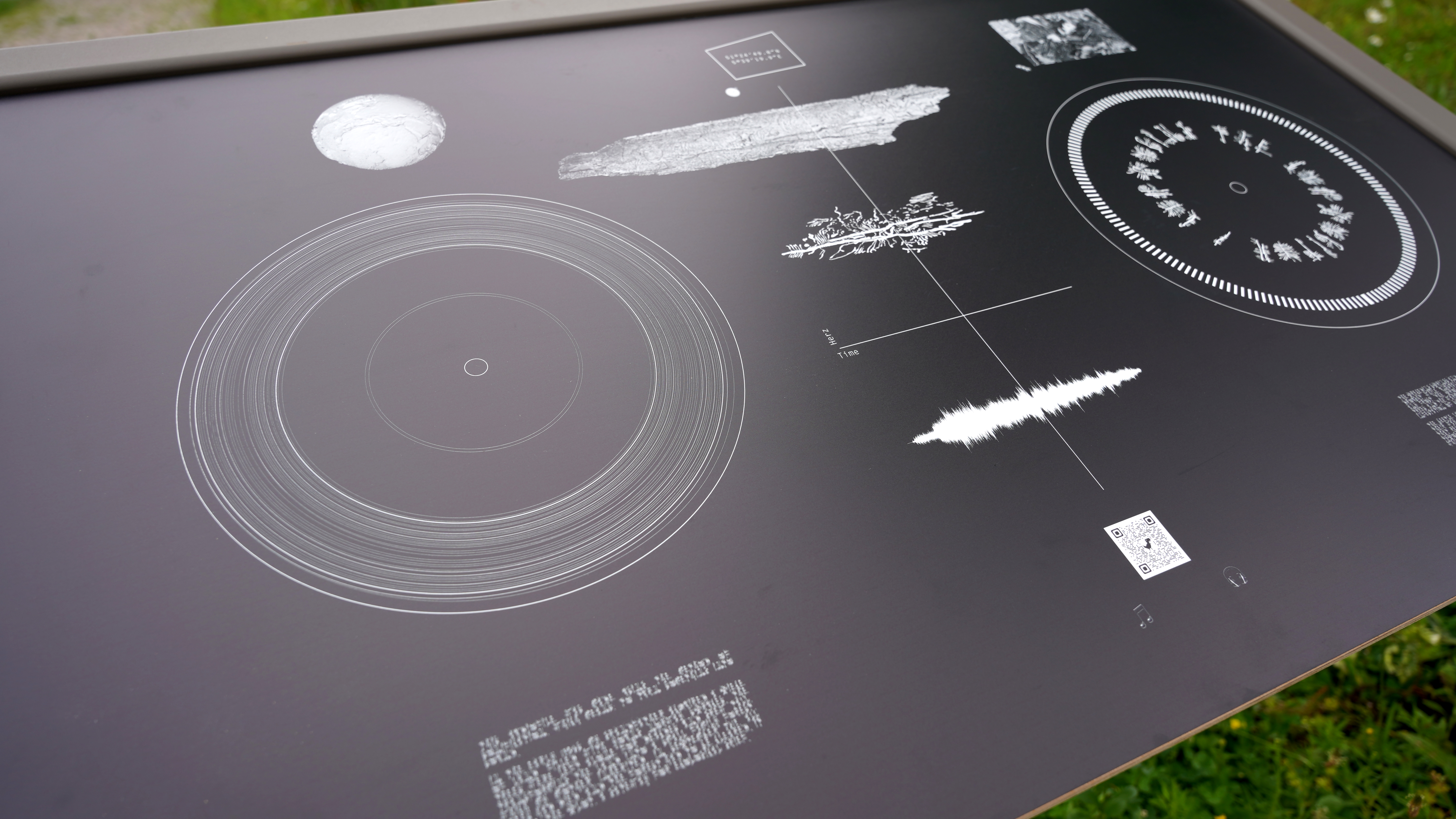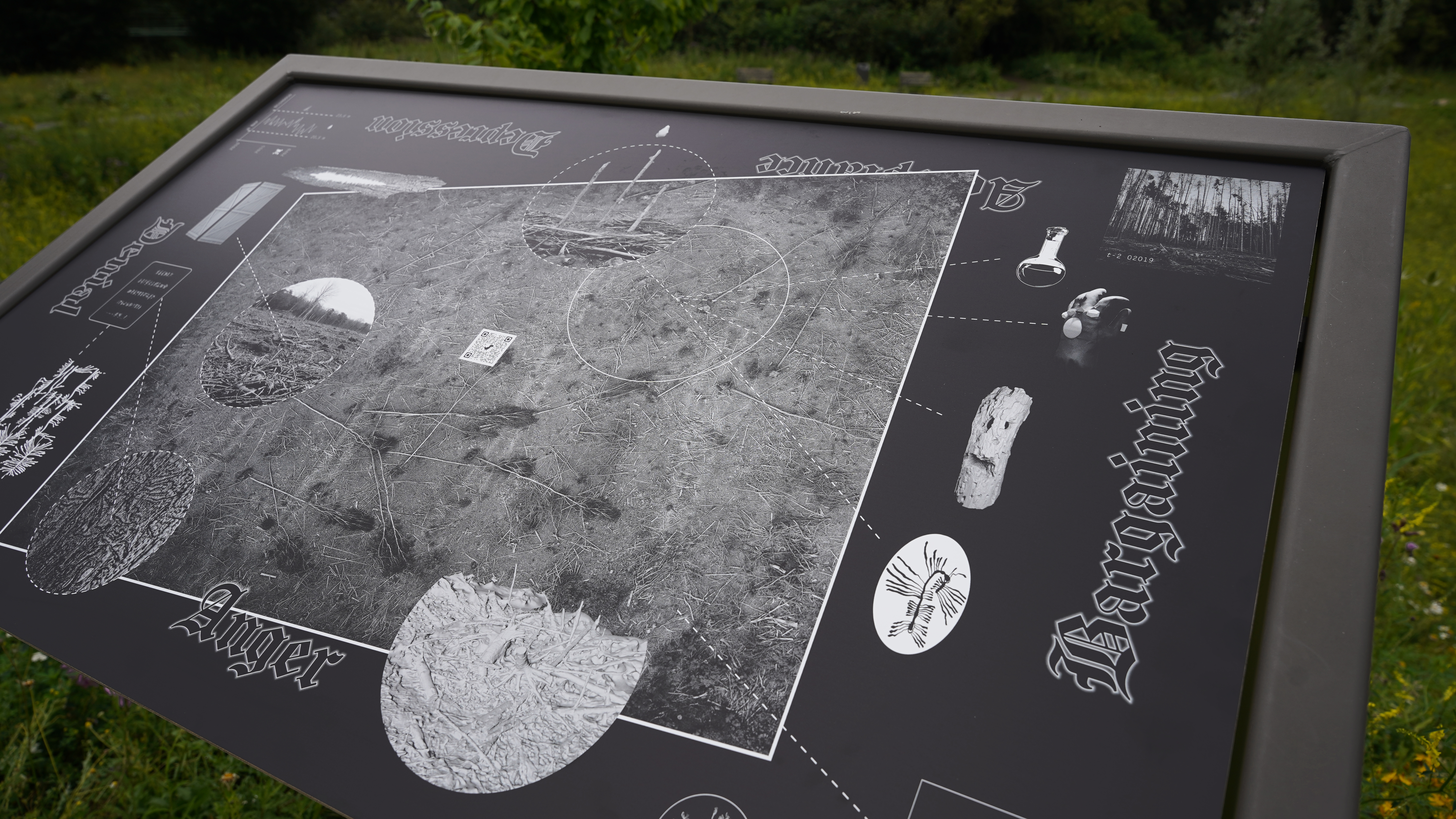 Information panels in metal frames and digital sculptures, various locations, 2021 – ongoing. Information panels, print on dibond, mounted on wood, QR codes, webpages, 118 x 71cm.