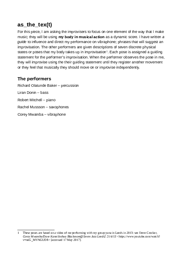 This piece asked improvisers to view my body in musical action as a dynamic score. From a video of a a performance in Leeds with my trio in 2013, I selected seven discrete physical states or poses that my body adopted while improvising. I drew line drawings of these poses, and utilised them in a schematic for improvisers