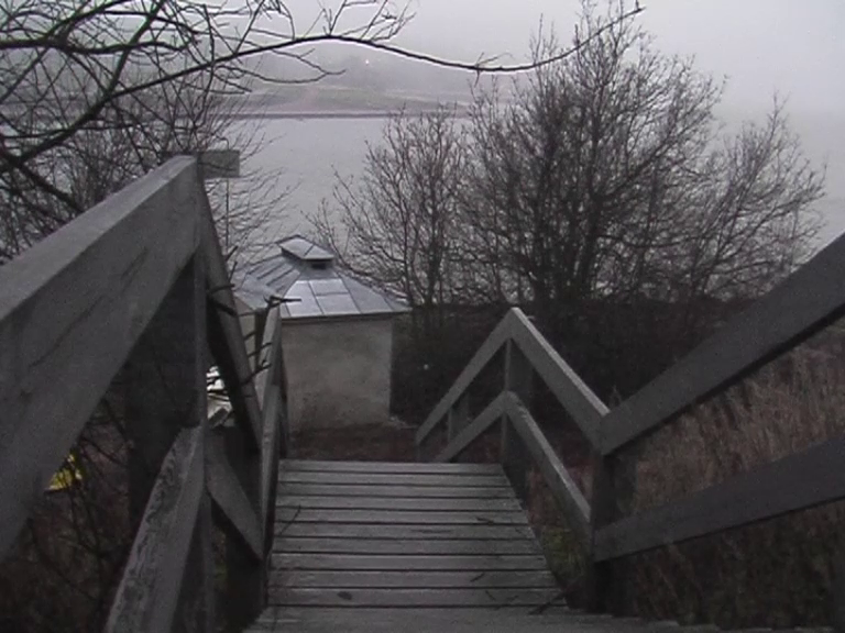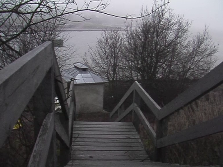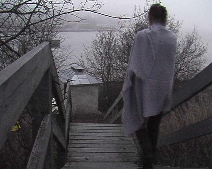 Part 1. (left) With a lilac scarf on my shoulders I walk down the steps on the Northern shore of Harakka Island approximately once a week before sunset between 26th January 2008 and 24th January 2009.