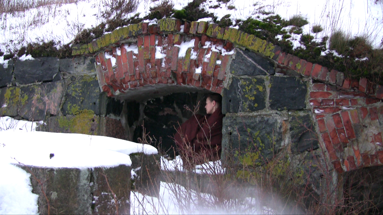 Part (1.) A rust-coloured scarf around my shoulders, I sit in a niche in the wall on the island of Harakka in Helsinki approximately once a week during a year from 25 January 2009 to 6 February 2010.