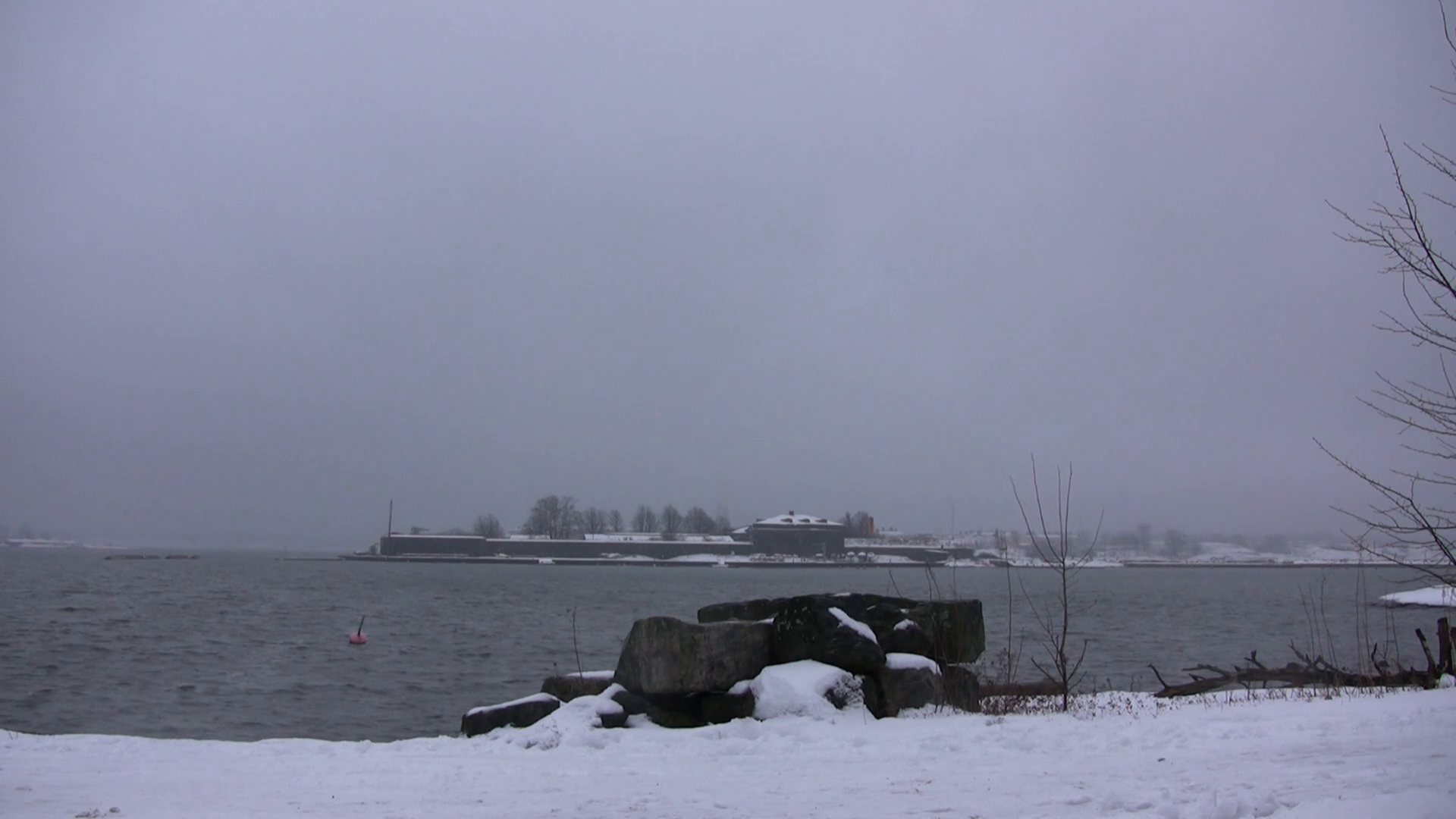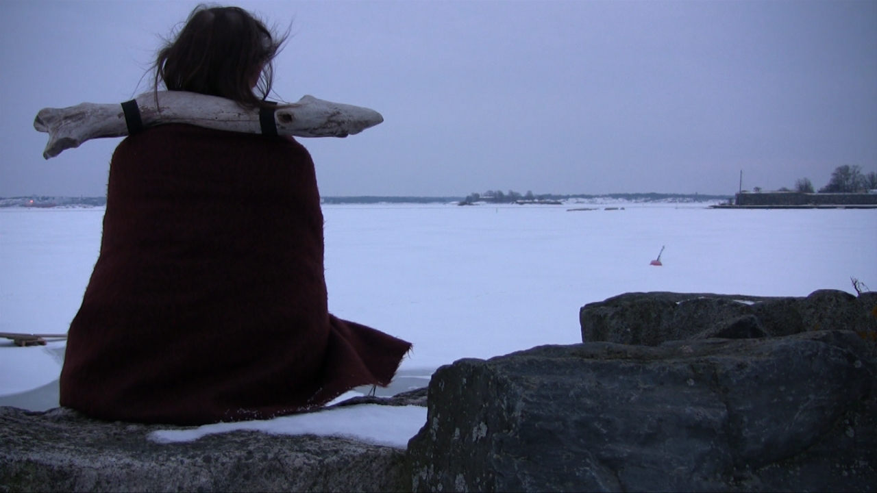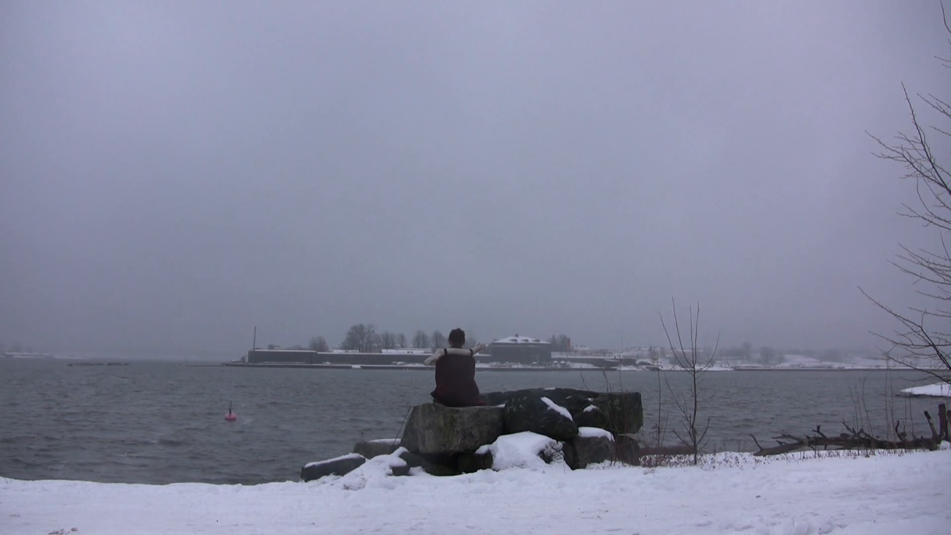 Part 1. Wrapped in a rust-coloured scarf and with a piece of wood on my shoulders, I sit on rocks on the Eastern shore of Helsinki’s Harakka Island approximately once a week for a year from 25 January 2009 to 6 February 2010.