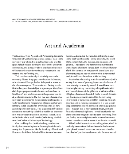 Art & Academia. Inaugural Address ('Installationstal') on behalf of the Faculty of Fine, Applied and Performing Arts, University of Gothenburg (Sweden) 6 May 2011.