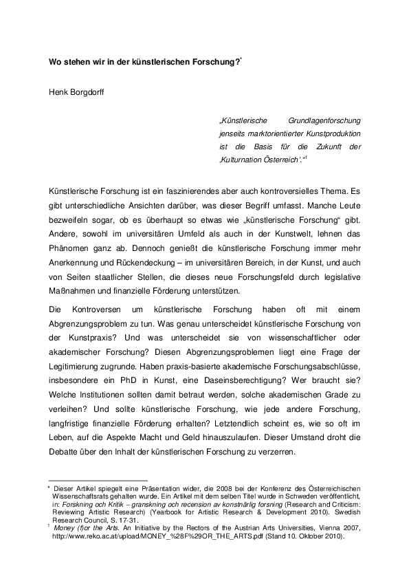 Wo stehen wir in der künstlerischen Forschung? Kunst und Forschung: Können Künstler Forscher sein?, ed. by Janet Ritterman, Gerald Bast and Jürgen Mittelstraβ (Vienna: Springer), 2011, pp. 29-55.