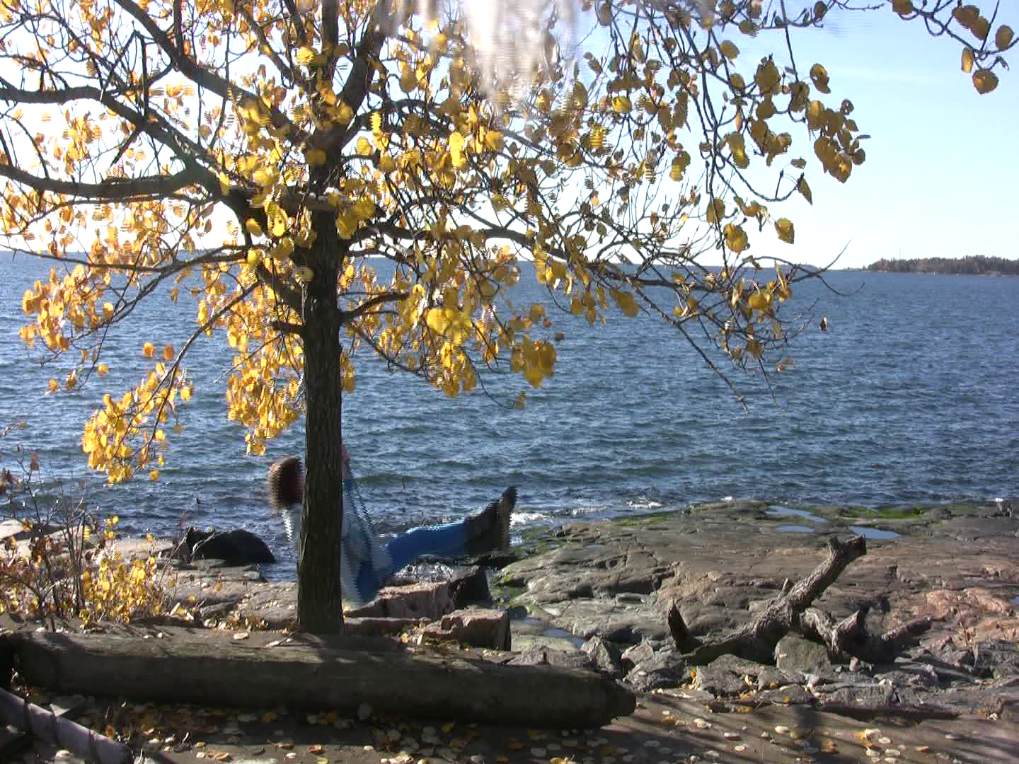 Wrapped in a pale blue scarf I am swinging in a swing attached to an aspen on the western shore for a day and a night with three-hour intervals from 13 October 2013 to 14 October 2013.