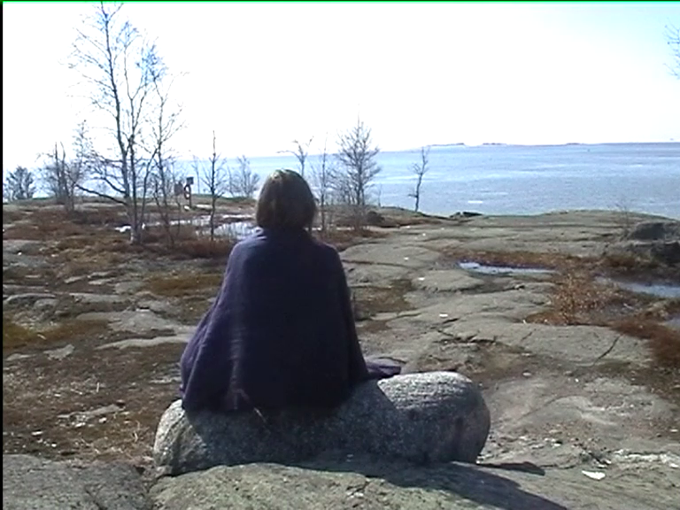 I am sitting with a blue scarf on my shoulders on a rock in the landscape, 13 times during a day and a night, with two-hour intervals, during Easter, from April 20 2003 at noon to April 21 at noon.