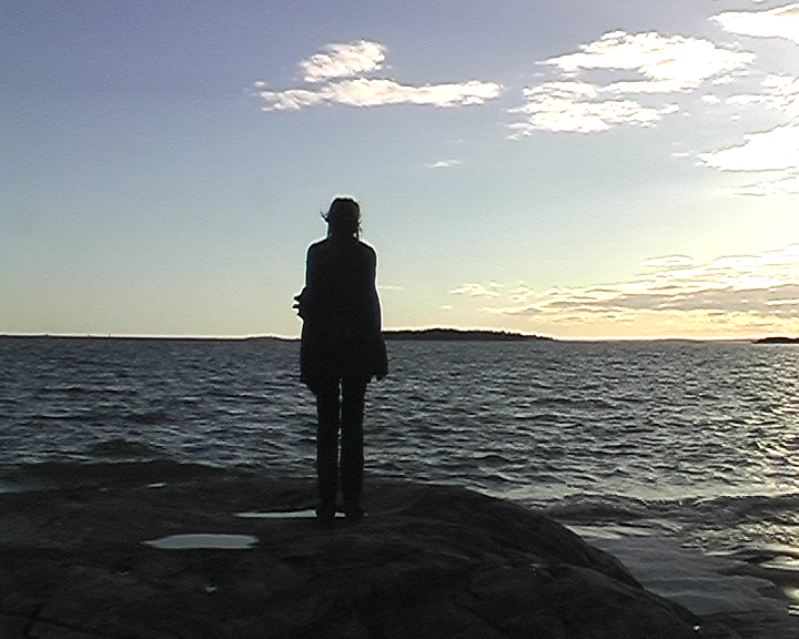 I am standing with a blue scarf on my shoulders on a cliff on Harakka Island looking out to sea, for a day and a night during Easter, 12 times, with two-hour intervals, from April 10 2004 at 19:00 to April 11 at 17:00.
