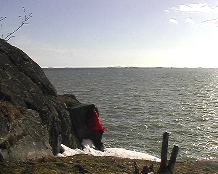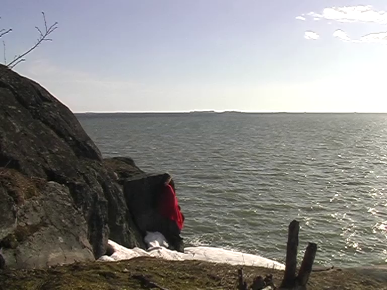 (22 min.) DV 4:3 This video is a documentation of a performance. I am sitting with a red scarf on my shoulders on a ledge on the northwestern shore of Harakka Island, 43 times, approximately once a week from April 11, 2004 to March 20, 2005.