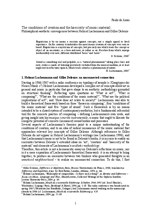 The conditions of creation and the haecceity of music materialPhilosophical-aesthetic convergences between Helmut Lachenmann and Gilles Deleuze (02/01/2012)