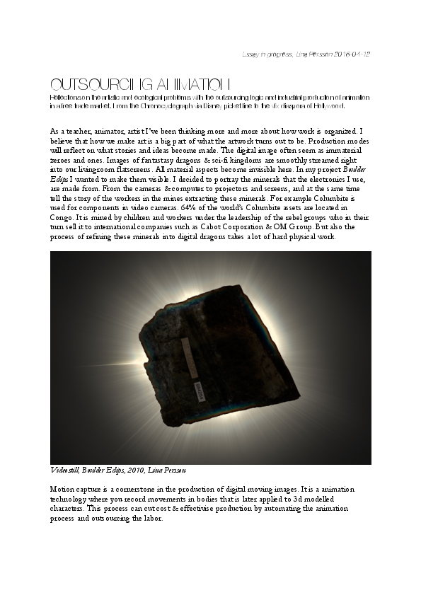 Essay reflecting on the artistic and ecological problems with the outsourcing logic and industrial production of animation in a free trade market. From the Chronocyclograph via Disney picket line to the vfx diaspora of Hollywood.