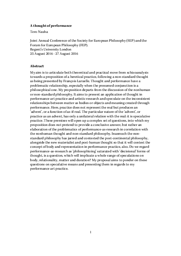My aim is to articulate both theoretical and practical move from schizoanalysis towards a proposition of a heretical practice, following a non-standard thought as being presented by François Laruelle. Thought and performance have a problematic relationship, especially when the presumed conjunction is a philosophical one. My proposition departs from the discussion of the nonhuman or non-standard philosophy. It aims to present an application of thought in performance art practice and artistic research and speculate on the inconsistent relationships between matter as bodies or objects and meaning created through performance. Here, practice does not represent the real but produces an ‘advent’, or a function of as-if-real. The particular nature of the ‘advent’, or practice as an advent, has only a unilateral relation with the real: it is speculative practice. These premises will open up a complex set of questions, into which my proposition does not pretend to provide a conclusive answer, but rather an elaboration of the problematics of performance-as-research in correlation with the nonhuman thought and non-standard philosophy. Inasmuch the non-standard philosophy has jarred and contested the post-continental philosophy, alongside the new materialist and post-human thought so that it will contest the concept of body and representation in performance practice, also. Do we regard performance-as-research as ‘philosophizing’ saturated with ‘decisional’ forms of thought, is a question, which will implicate a whole range of speculations on body, relationality, matter and duration? My proposal aims to ponder on these questions on speculative means and presenting them in regards to my performance art practice.
