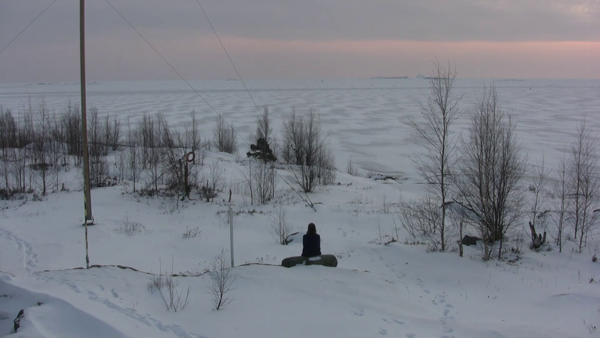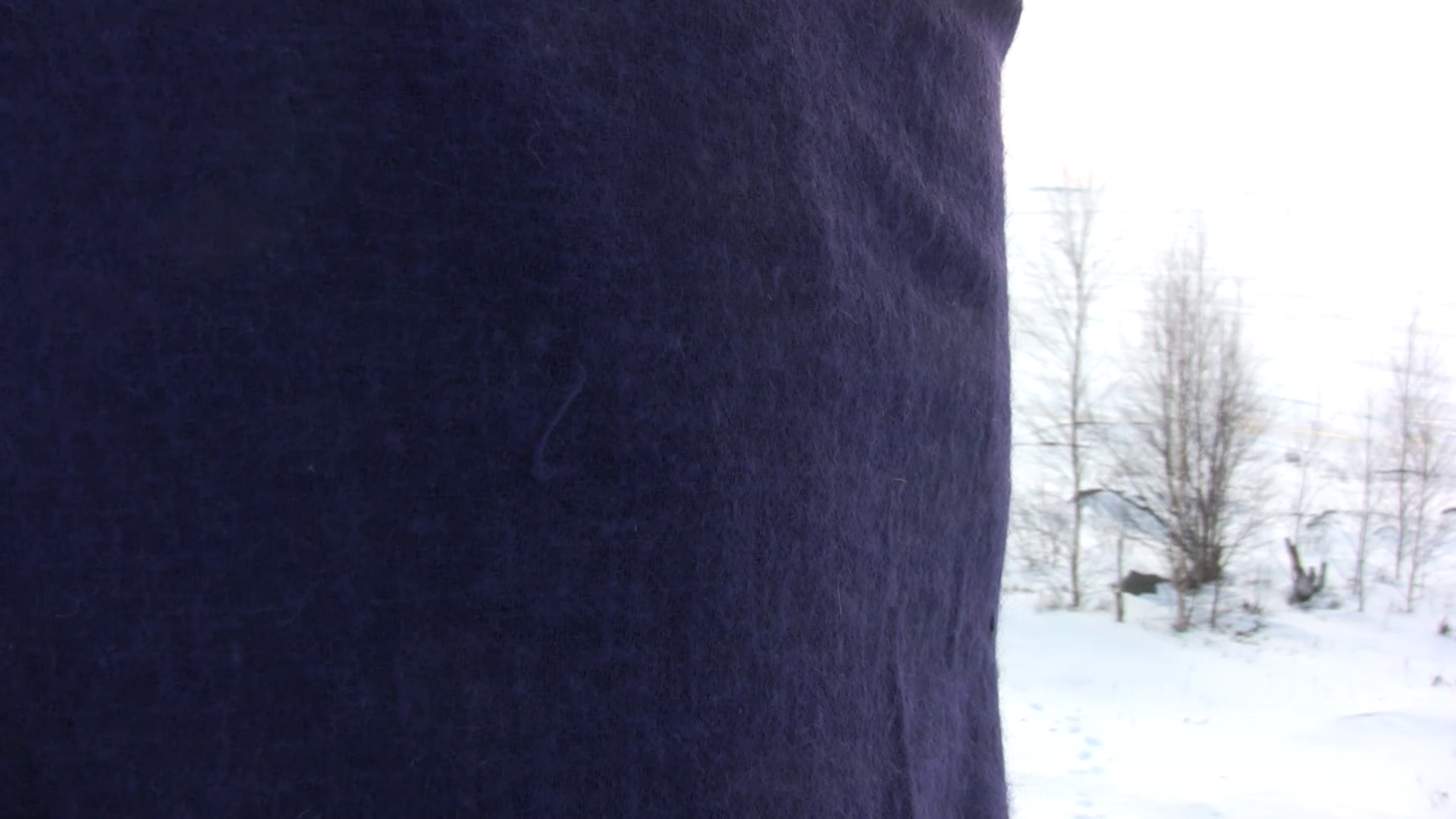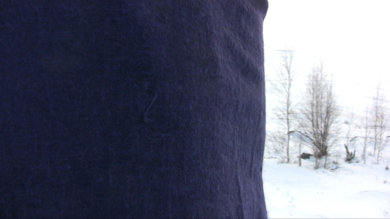 This video (2 x 11 min 10 sec) is a documentation of a performance. I am standing with a blue scarf on my shoulders close to the camera, obscuring part of the view from the cliff, on Harakka Island, 12 times, once a month from January 2014 to January 2015. During the year of the horse 2014 I revisited once a month the site on Harakka Island, which I visited once a week during the year of the horse 2002, wearing the same dark blue scarf. Part 1: I stand on the hill in front of the camera, covering most of the view. Part 2: I sit on a rock on the slope.