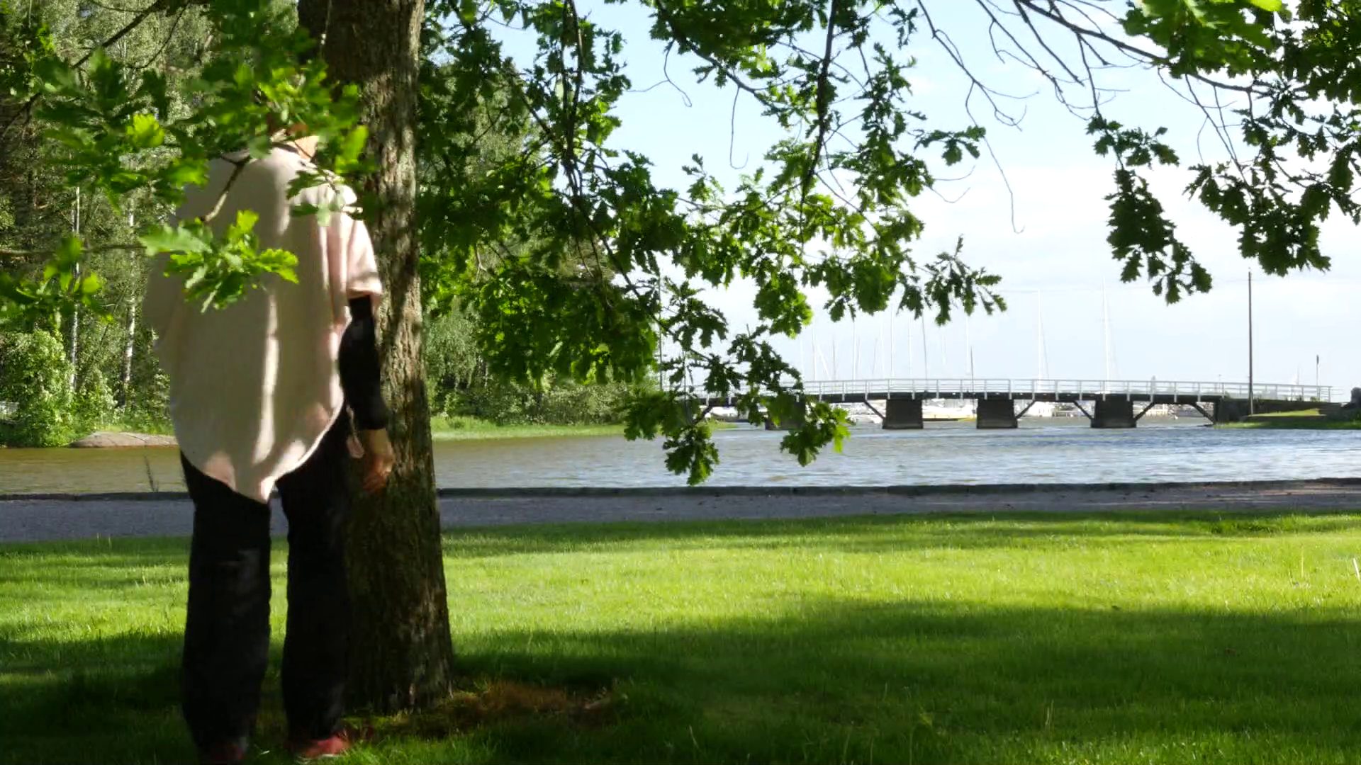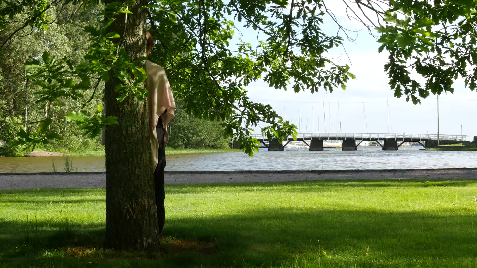 Standing with and leaning against an Oak in Eugen Schauman's Park in Brändö, Helsinki, on Sunday night June 26 as part of the Tree Calendar. Oak in June (8 min 10 sec.) Preparatory attempts are documented in Oak in June - testing (3 min 31 sec.)