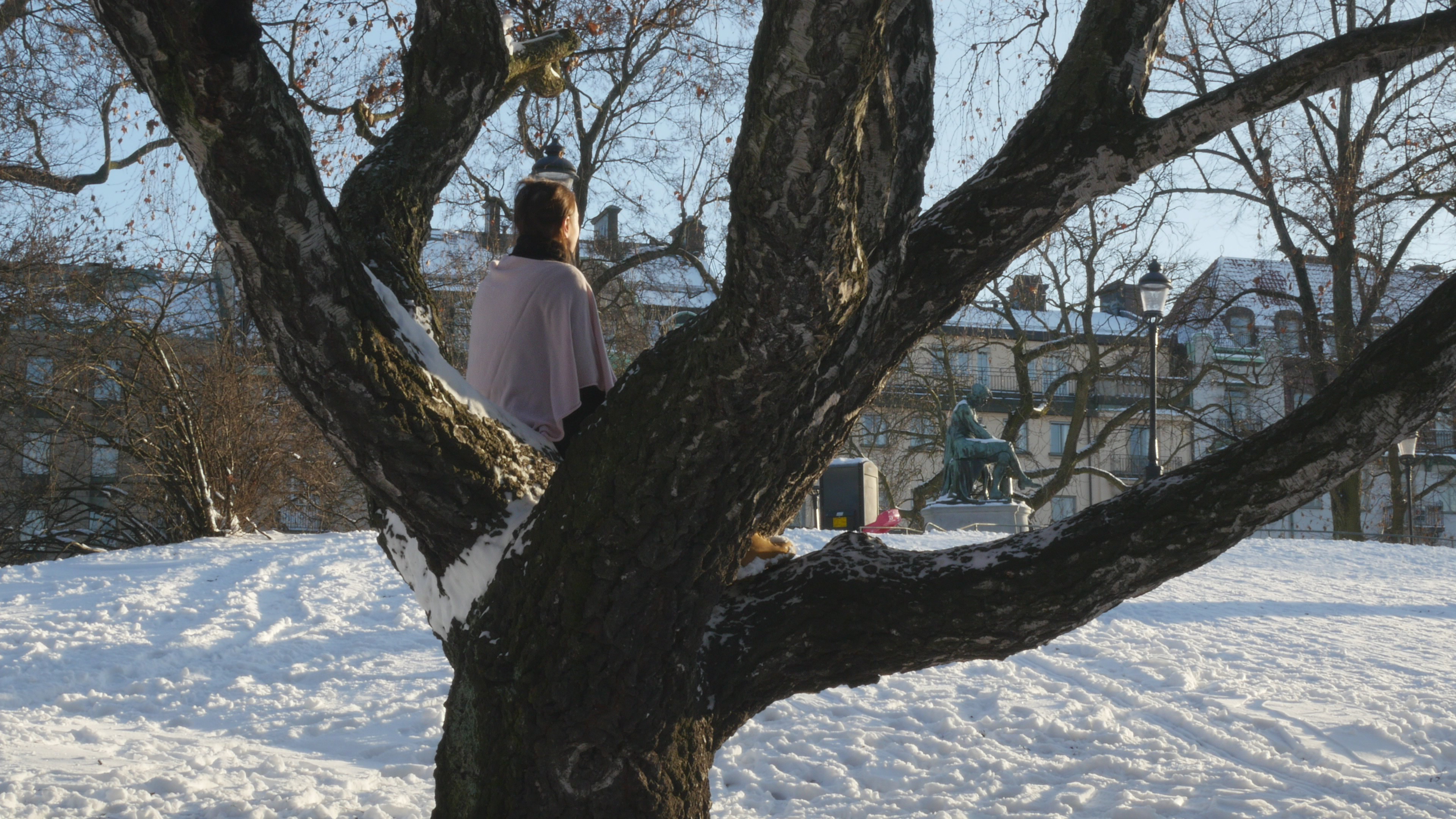 Sitting in a birch at Humlegården on 22 January 2018, performing for camera for the Stockholm Tree Calendar (2018), video 9 min. 55 sec.