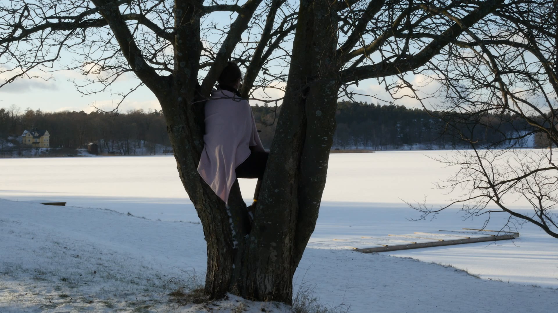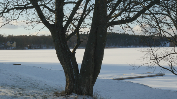 Sitting in a rowan (or Swedish Whitebeam) at the shore of Kräftriket park on 4 February 2018, performing for camera for the Stockholm Tree Calendar (2018), video 9 min. 33 sec.