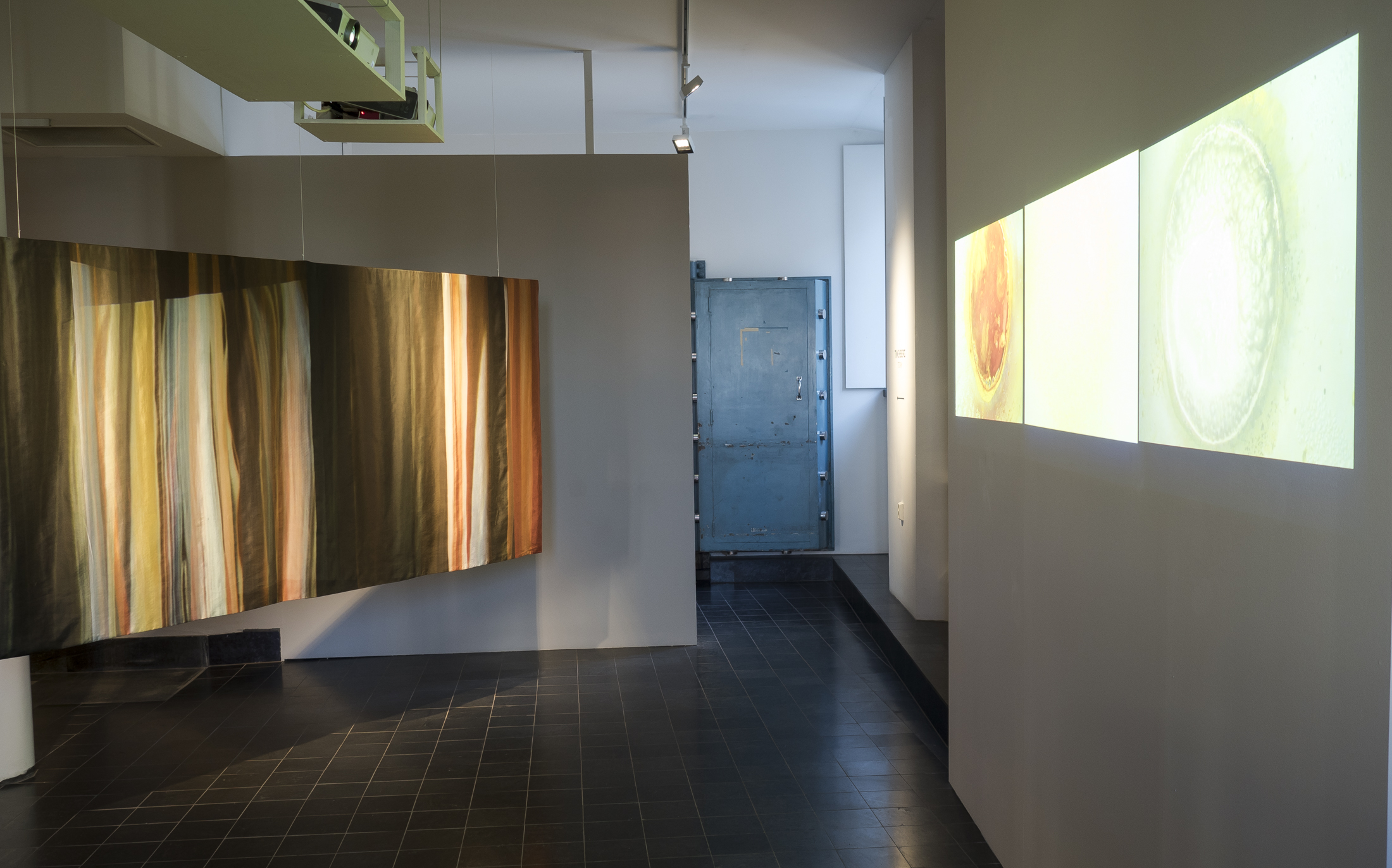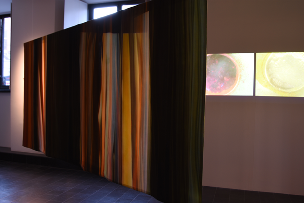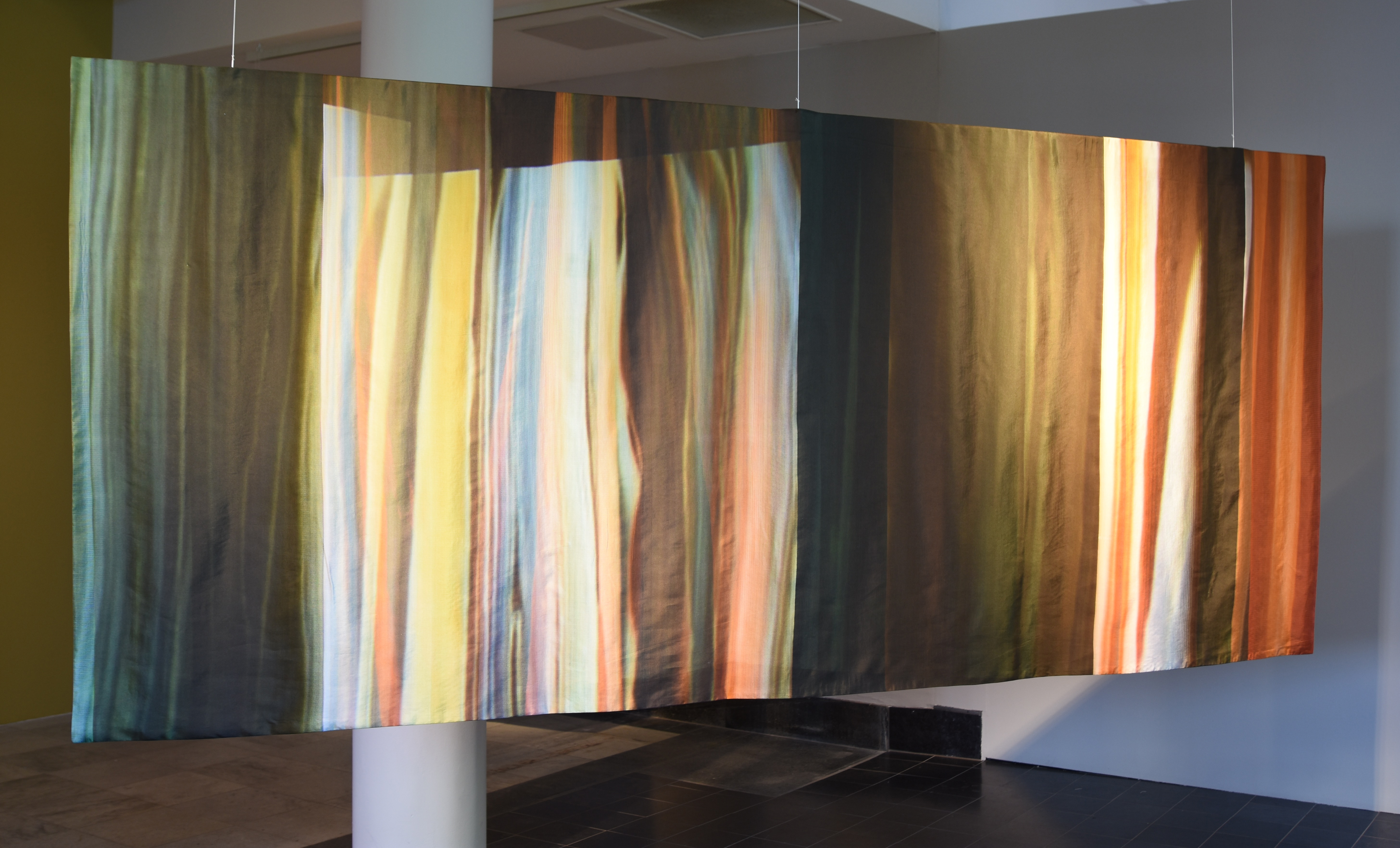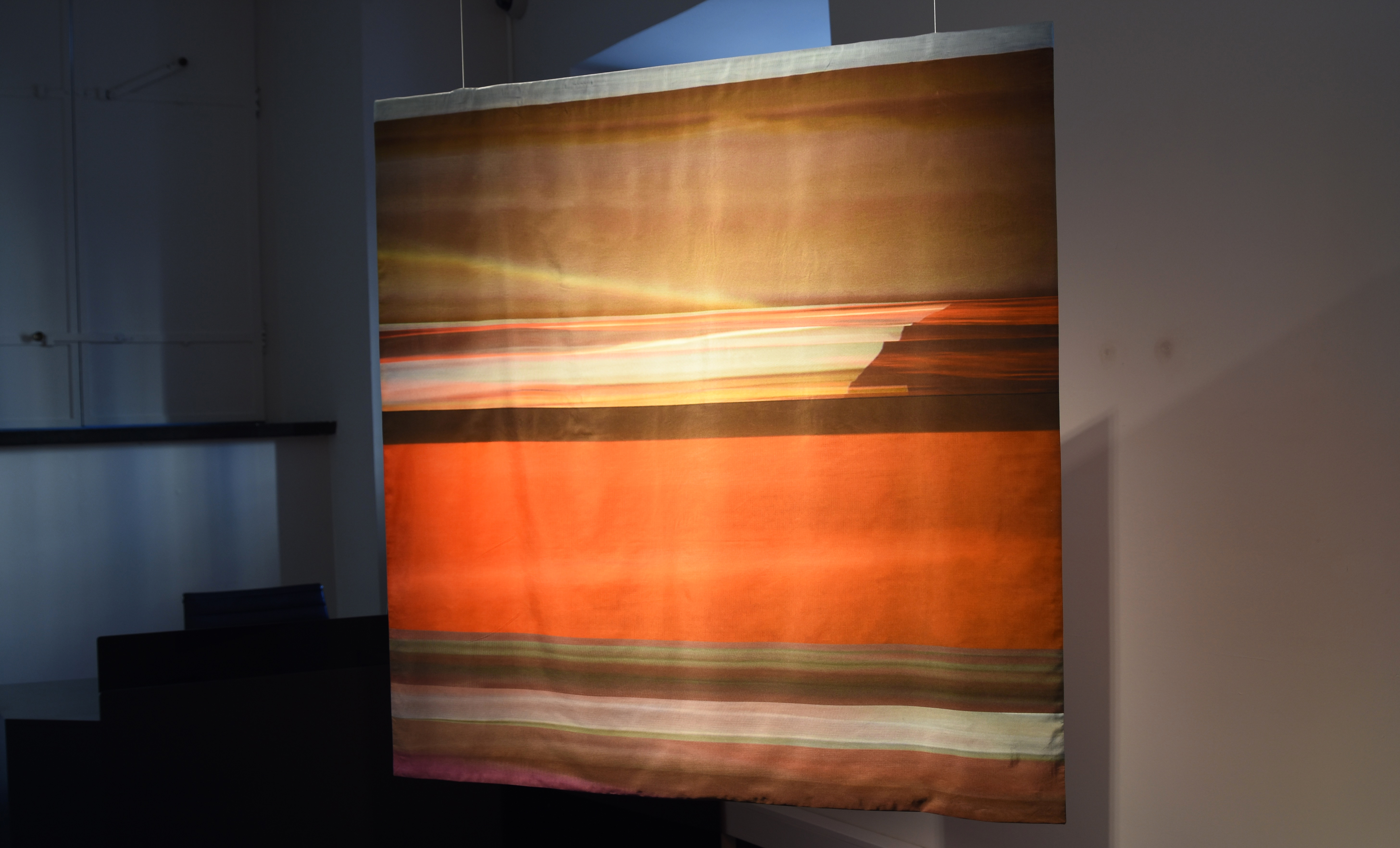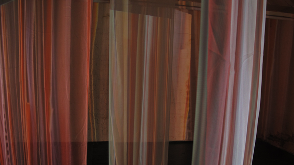 Installation of two-sided, digitally printed textile works. Silk / cotton, reactive dyes. Artworks based on frozen documentary images from the former, shifting light installations. Also including a video work; Aerial, depicting color pigments boiling.