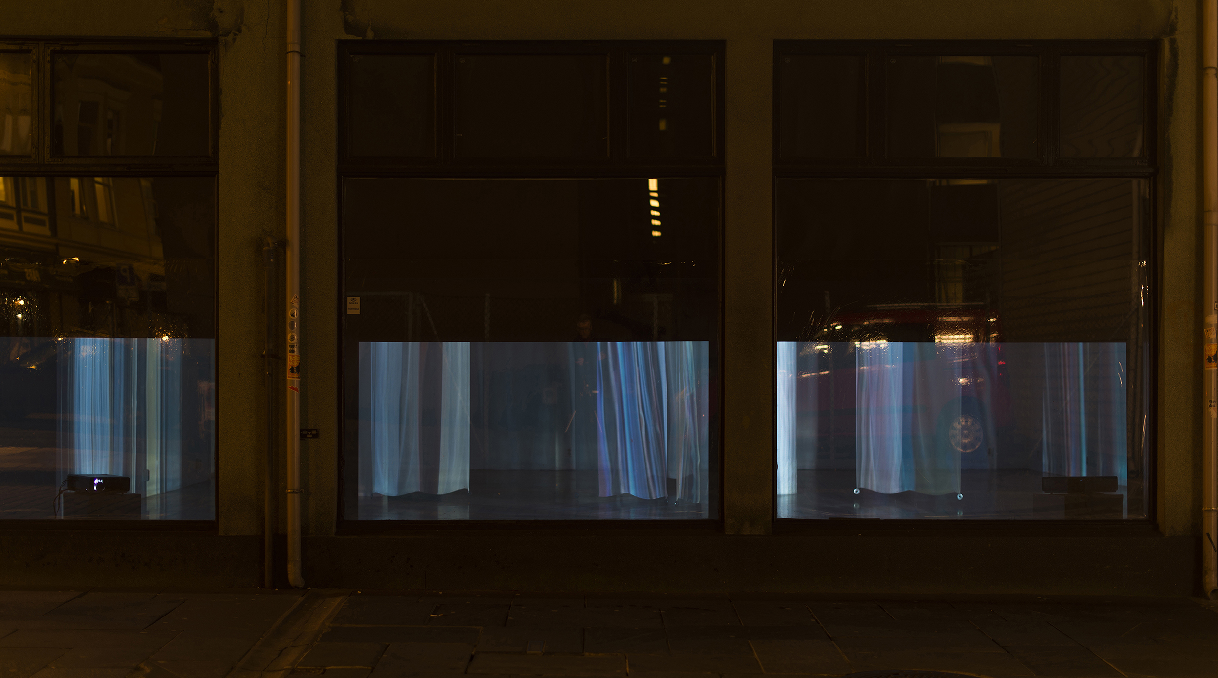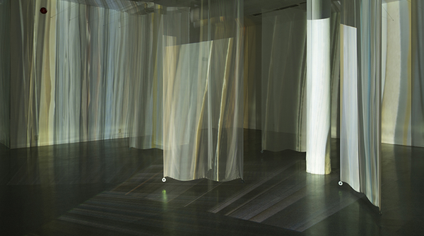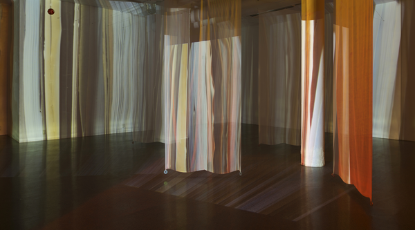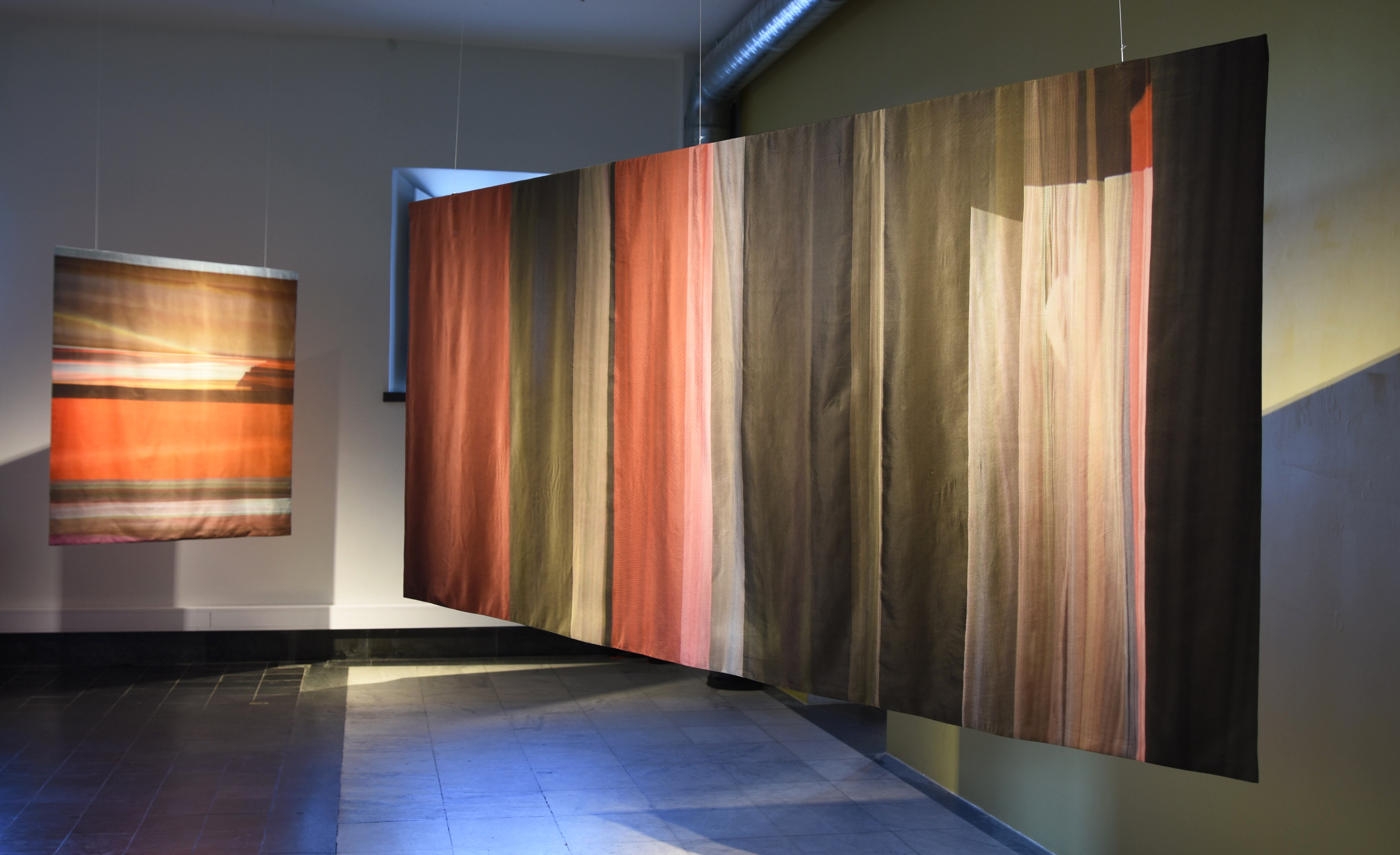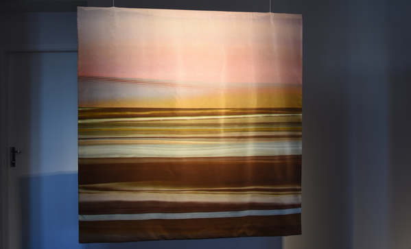 Installation of two-sided, digitally printed textile works. Silk / cotton, reactive dyes. Artworks based on frozen documentary images from the former, shifting light installations. Also including a video work; Aerial, depicting color pigments boiling.