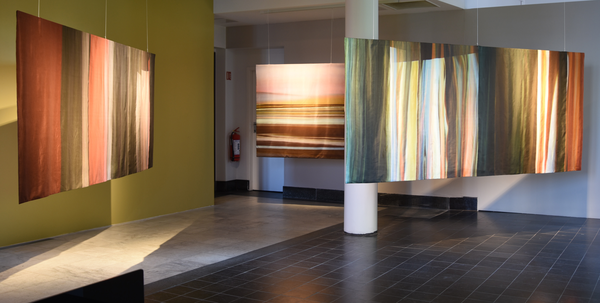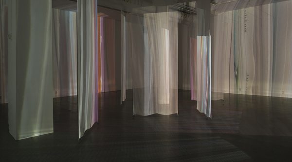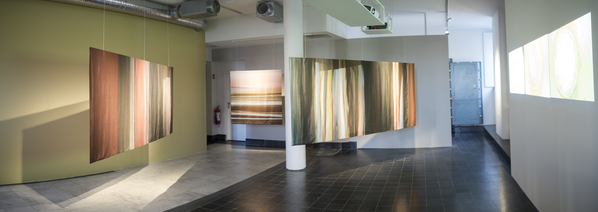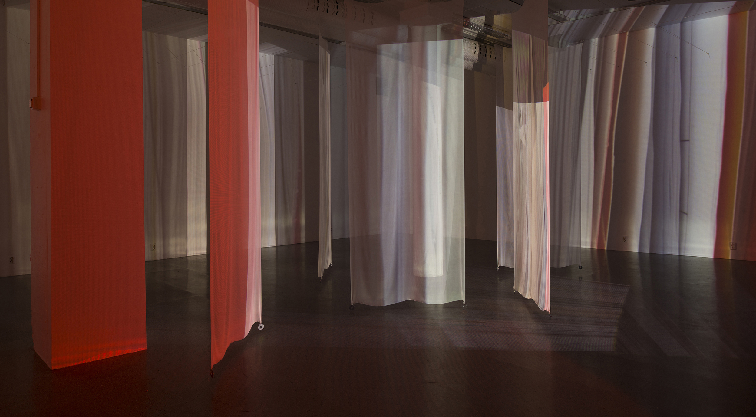 Installation of two-sided, digitally printed textile works. Silk / cotton, reactive dyes. Artworks based on frozen documentary images from the former, shifting light installations. Also including a video work; Aerial, depicting color pigments boiling. Overview.
