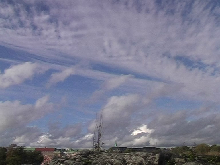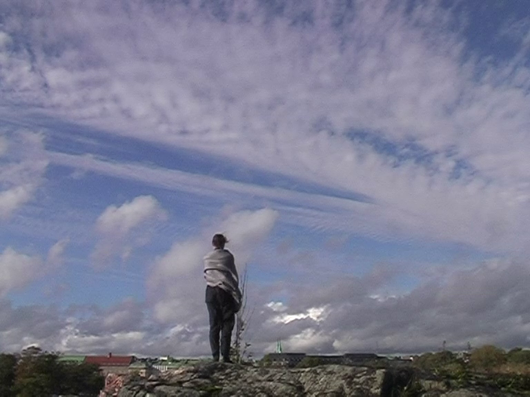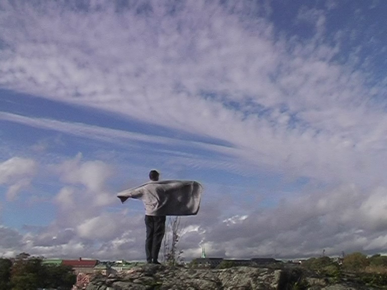 A three-channel installation version of Day and Night of the Pig (รก 2 min 53 sec.), 2008, a documentation of a performance that took place on the north-western cliffs of Harakka Island, Helsinki. Holding a grey shawl and two small torches, I stand or spin against the backdrop of the city on the cliffs for a day and night every two hours during the autumnal equinox from 22 September 2007 at 16.00 to 23 September at 14.00.