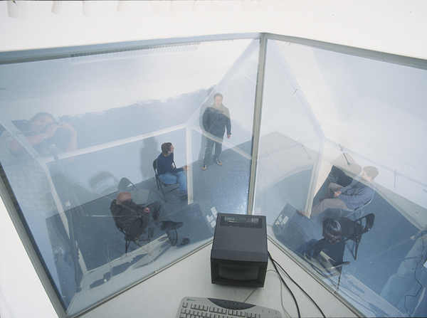 "Observation Tower" is a 3-meter high tower that sat at one corner of the graduate seminar room of the San Francisco Art Institute, during Spring 2002. It was fabricated from L-beam and consisted of three modules, all painted white. The last module had one-way mirrored plexiglass on two faces and a wooden platform.