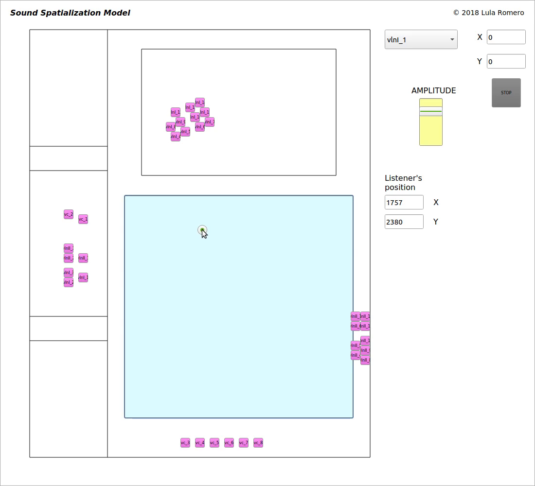 This video is a screencast of the software sound spatialization model in SuperCollider. The model simulates how a virtual listener could hear the different sound sources in the performance space. Experiment 1 is one of a series of experiments using the model. The goal of experiment 1 is to research the different perceptions of sound materials and their function depending on the listener's position. To be heard with headphones.