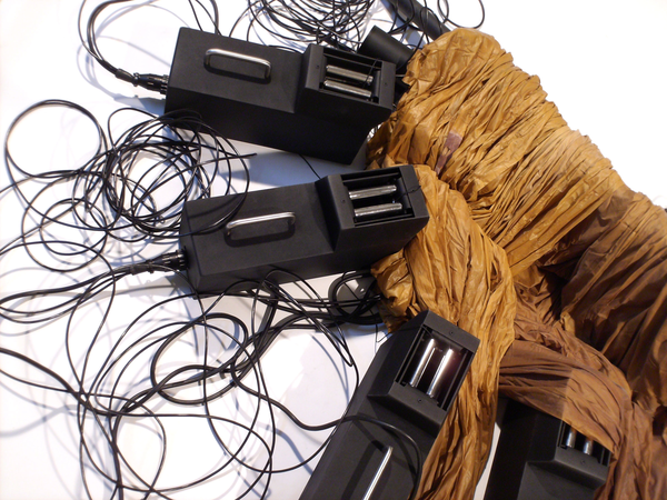 Electric winch, steel sheet, acrylic paint, latex balloon, electric cables, switches, various other materials
