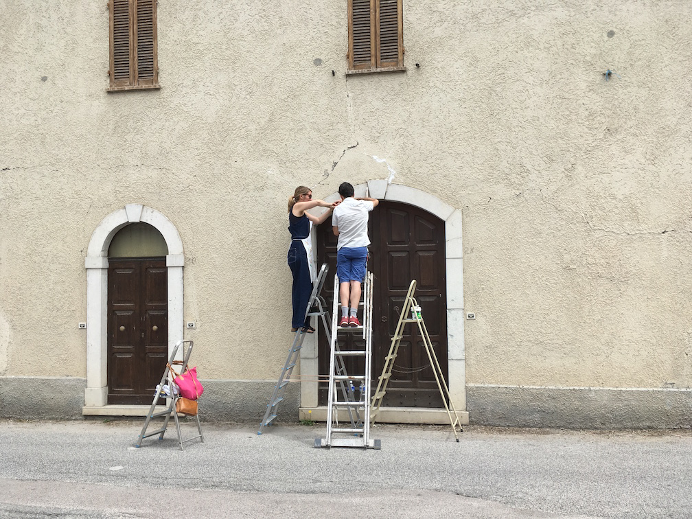 Christina was invited to do a residency in the Italian mountain village Preci struck by earthquake some years earlier. Habitations were destroyed and the population demotivated. A large building in the centre of the village was still standing but displaying a large crack in the facade.