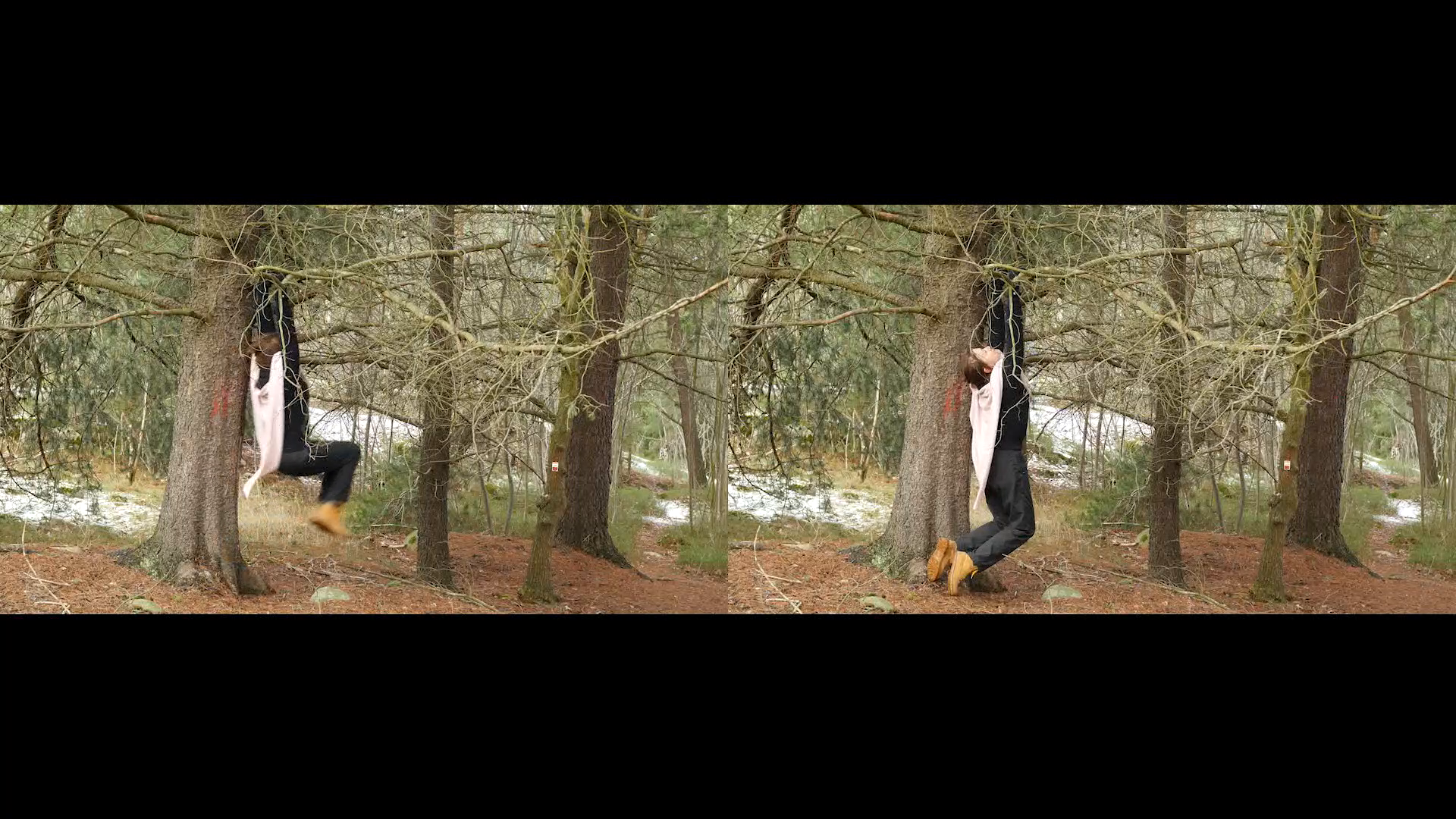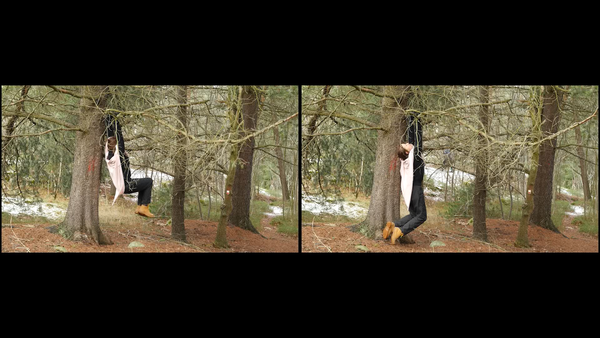 This video is part of "Year of the Dog in Lill-Jan's Wood" performed and recorded in Stockholm between 15 February 2018 and 3rd February 2019. The split-screen version consists of "Swinging in a Pine" (15 min 28 sec) and "Hanging in a Pine" (15 min 28 sec.).