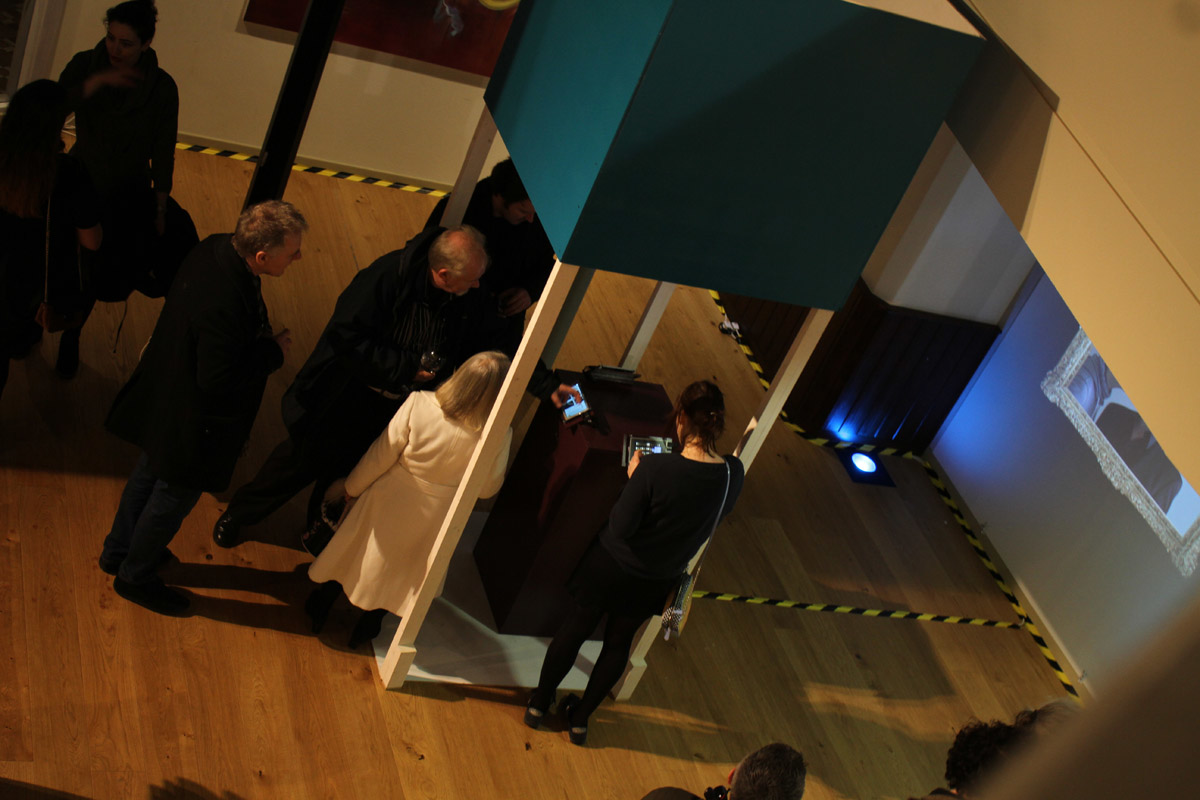 Documentation of people interacting with the interactive digital artwork 'apo' (2017) by Irish visual artist Shane Finan at the launch event, February 2017 in Duncairn Arts Centre, Belfast