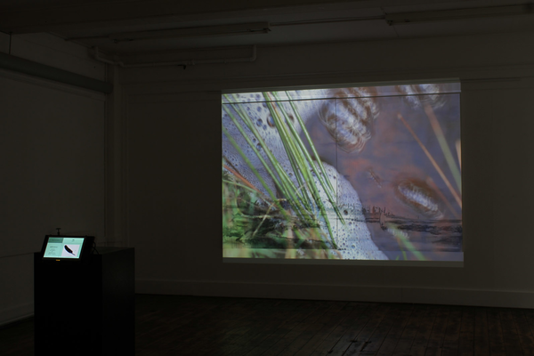 Installation photograph of interactive digital art installation 'faigh ar ais as an fharraige' (2018) by Irish visual artist Shane Finan, installed at Rye Creative Centre, UK, March 2018