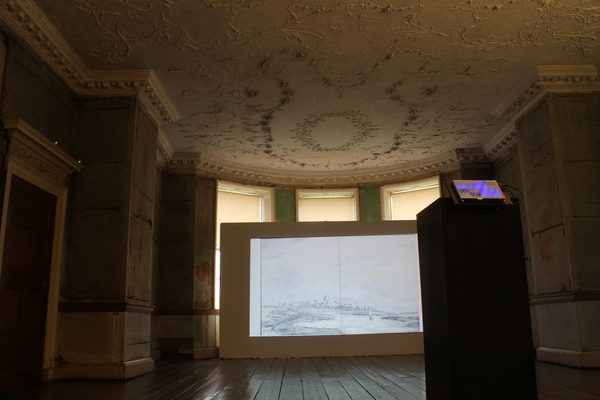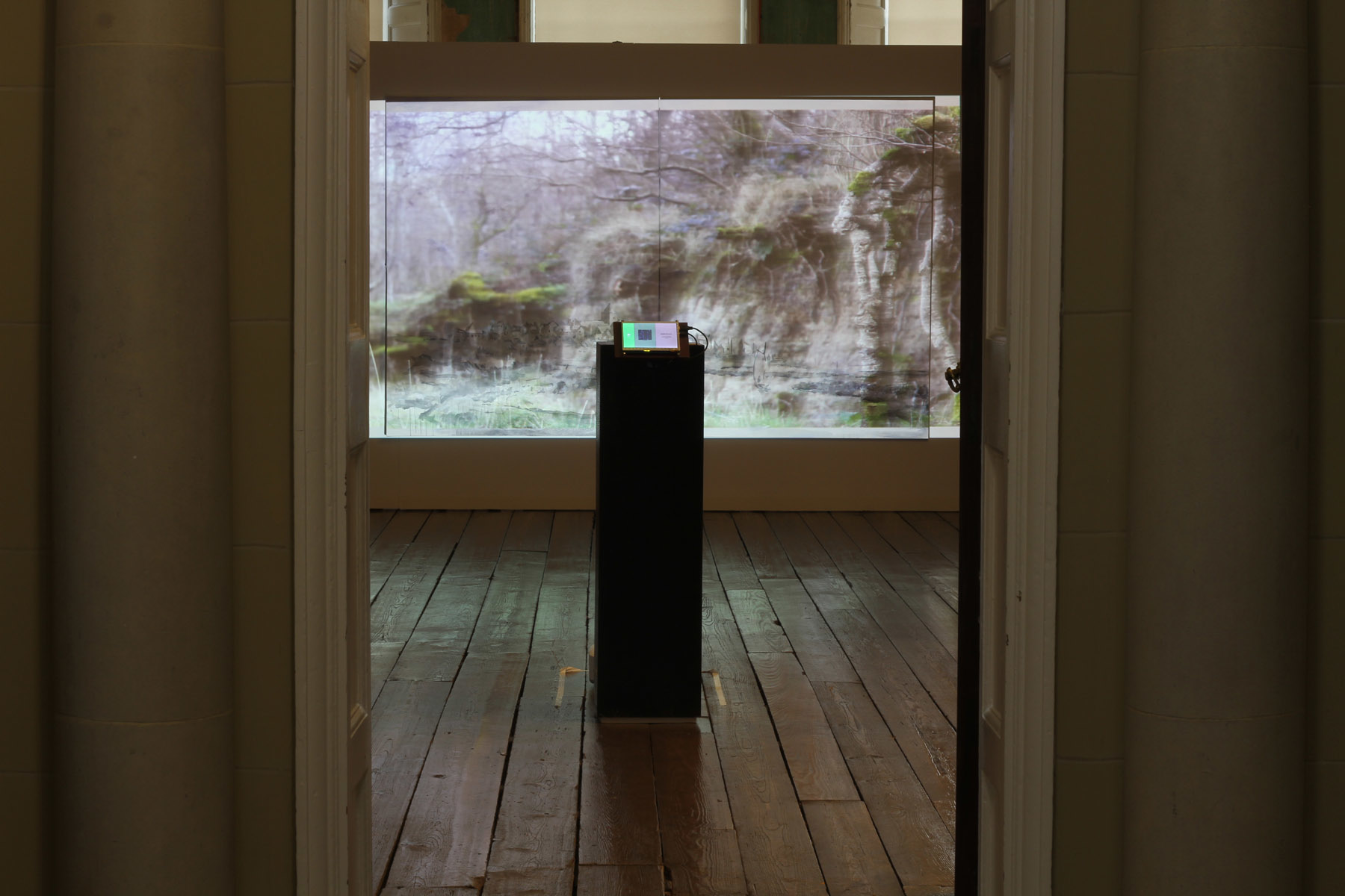 Installation photograph of interactive digital art installation 'faigh ar ais as an fharraige' (2018) by Irish visual artist Shane Finan, installed at Rathfarnham Castle, November 2019About this installation