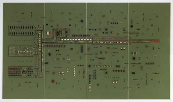 The Great Decline combines the blueprints of the Svalbard Global Seed Vault, visualised as a copper circuit on large scale PCBs (Printed Circuit Boards), and a wide variety of seeds collected from around the world. Together they create a huge Lukasa, or memory board, that imitates the ones used by the Bambudye within the Luba Kingdom in the Democratic Republic of Congo (throughout the 19th and 20th Century) as an archive for the topographical and chronological mapping of political histories and as a means to recollect important people, places and mythical migration routes. The seeds on The Great Decline were collected from the Botanical Garden of Meise (Belgium), Jardin Botanique de Lubumbashi (D. R. Congo), and various other places around the world. They are organised in relation to the graphical outlines of the blueprint of the Svalbard Global Seed Vault and mimic transistors and other electrical components that are mounted on PCBs. They evoke the memory of seed collection, preservation, modification and militarisation.