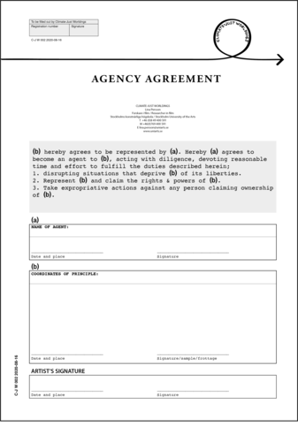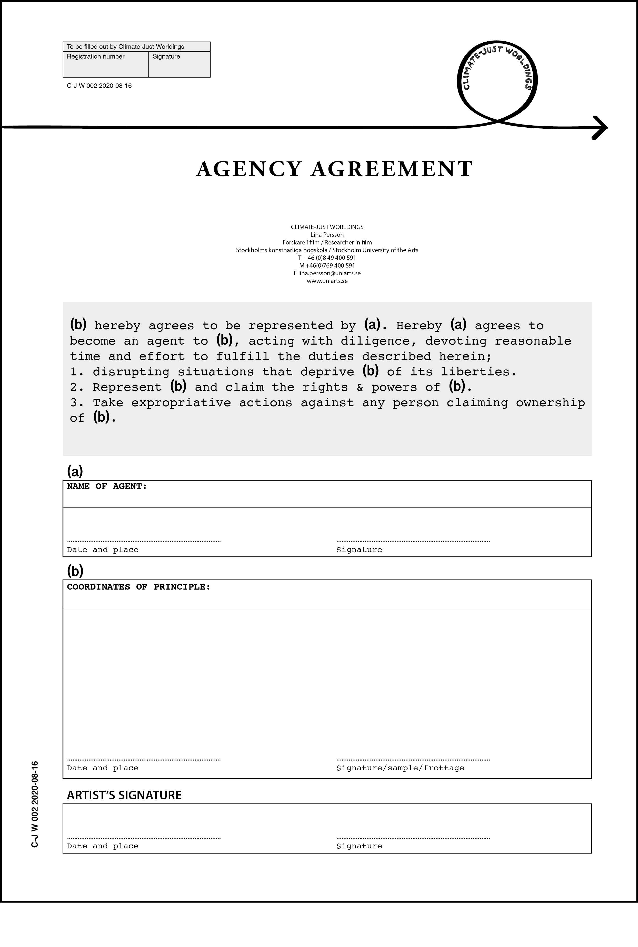Has it come to your awareness that a natural entity is being deprived of its liberty? Sign an agreement to act as agent to ensure it's liberties and rights! Print and send two copies to Lina Persson, Climate-Just Worldings, Stockholms Konstnärliga Högskola, Valhallavägen 189, 115 53 Stockholm. You will recieve one copy back in the mail, with a artist's signature.