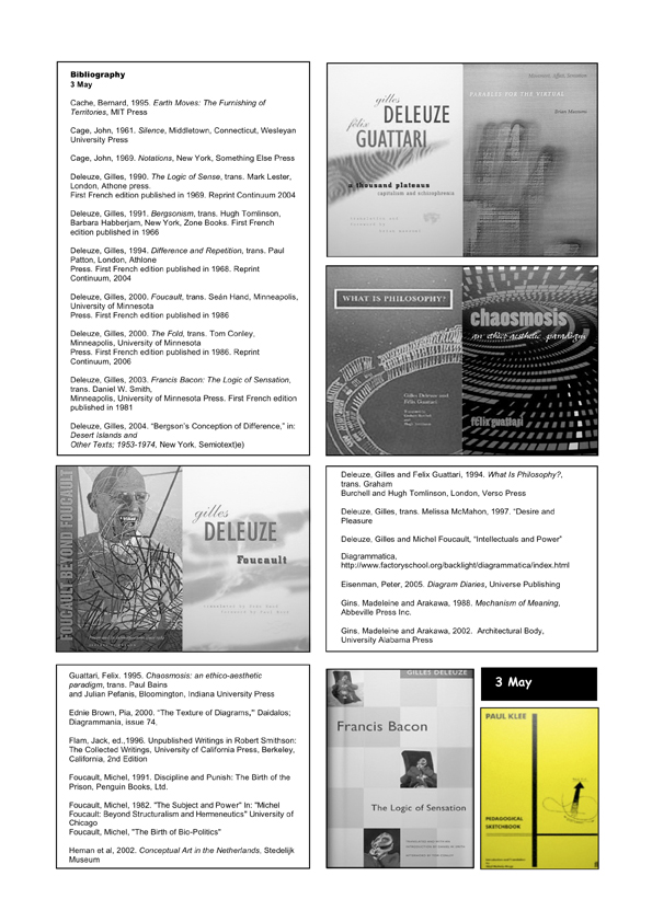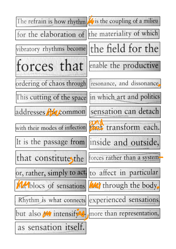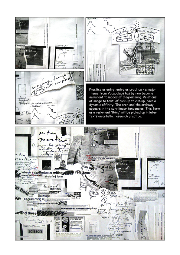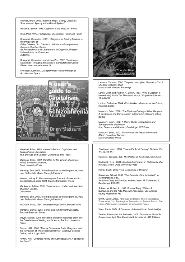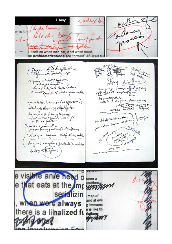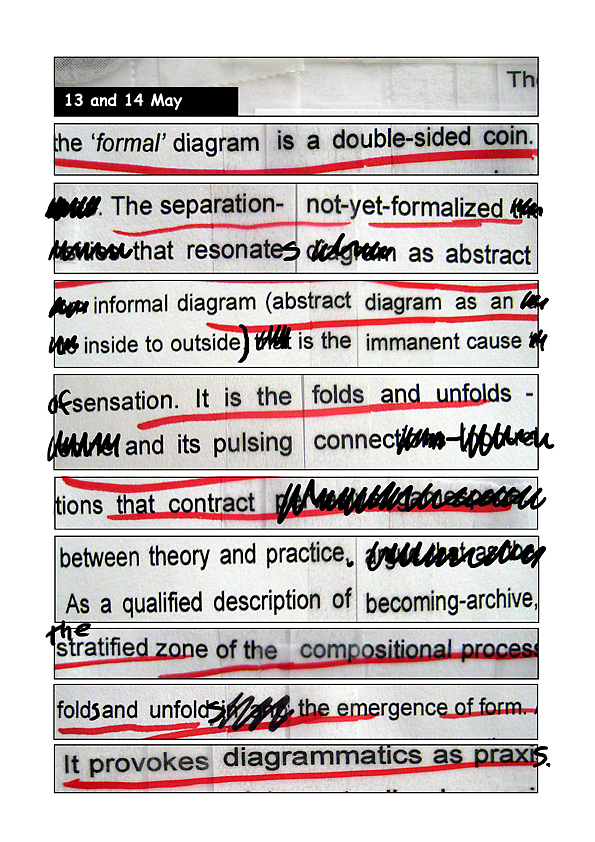 Examples of an experiemental reading process of texts for discussion with colleagues and students as a re-markable, diffractive diagrammatic mapping of image/text elements, emphasis, and paratactical relations. Texts included Jacques Ranciere’s text “Sentence, Image, History” and Elizabeth Grosz’s Chaos, Territory, Art: Deleuze and the Framing of the Earth.