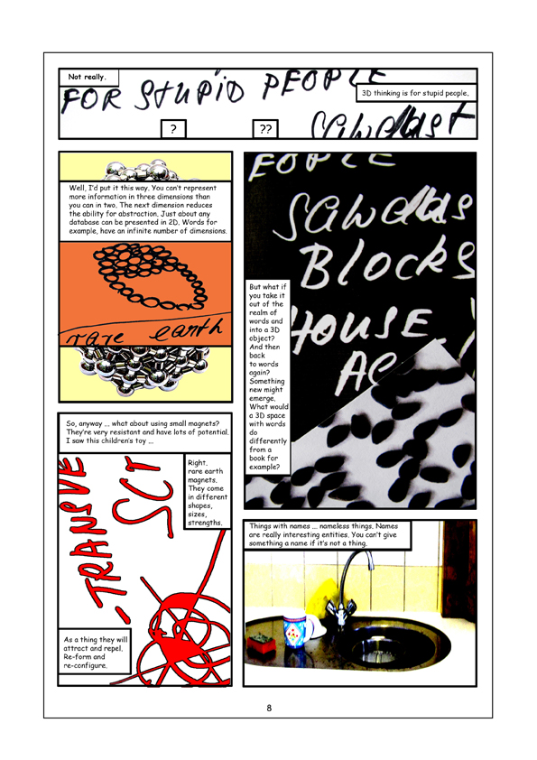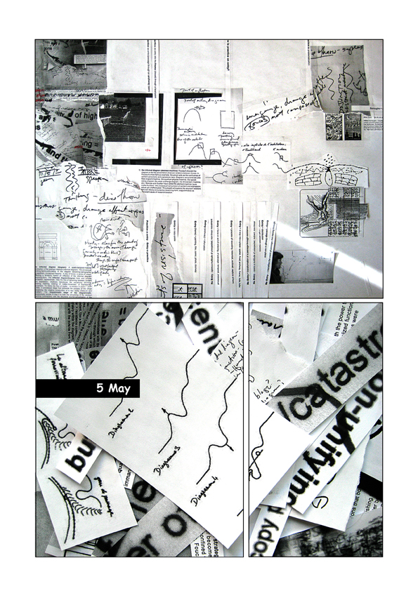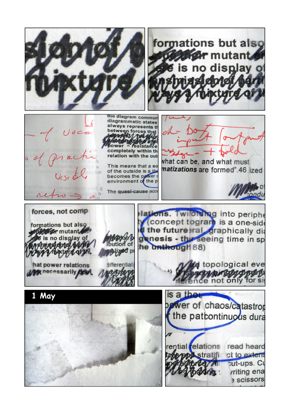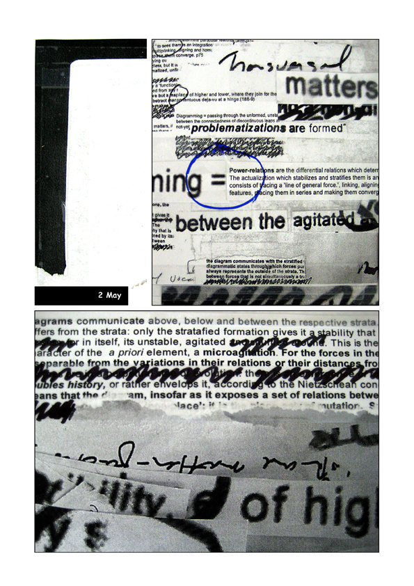 Presented here is a chronological strip format of daily activity, the relations between keywords, phrases, cut-ups and images move towards the production of a paper for the books Vocabulaboratories.