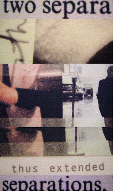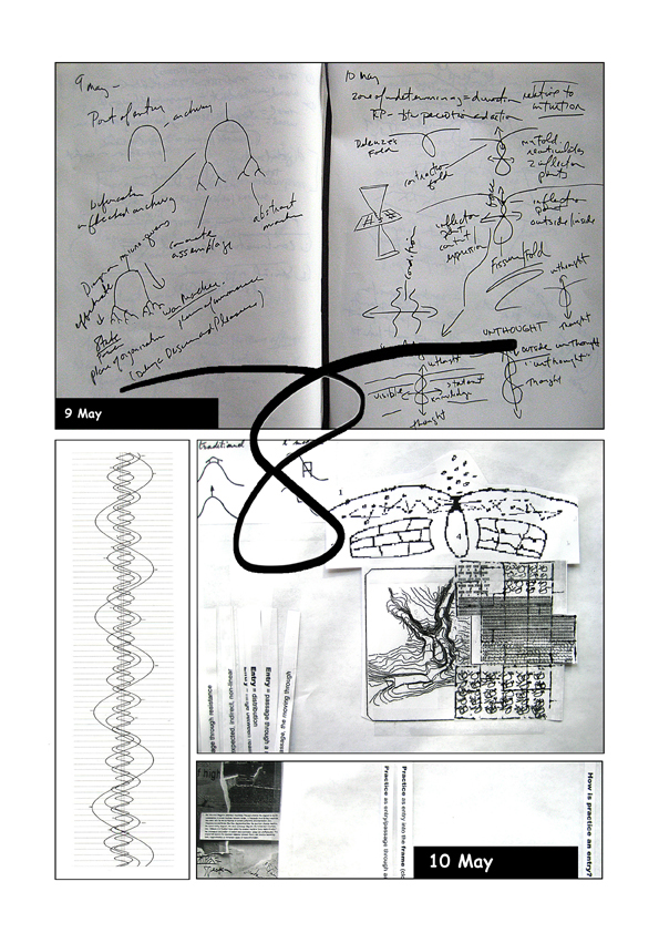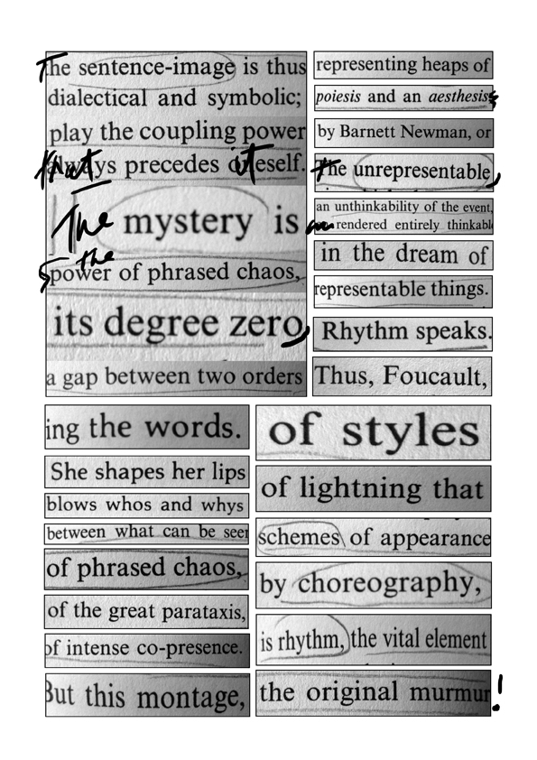 The daily process of writing and collaging image and textual elements precipitated the unfolding of diagrammatic relations during an artist residency at Concordia's Senselab, Erin Manning and Brian Massumi’s research-creation initiative, housed at the Society for Arts and Technology (SAT) in downtown Montreal.