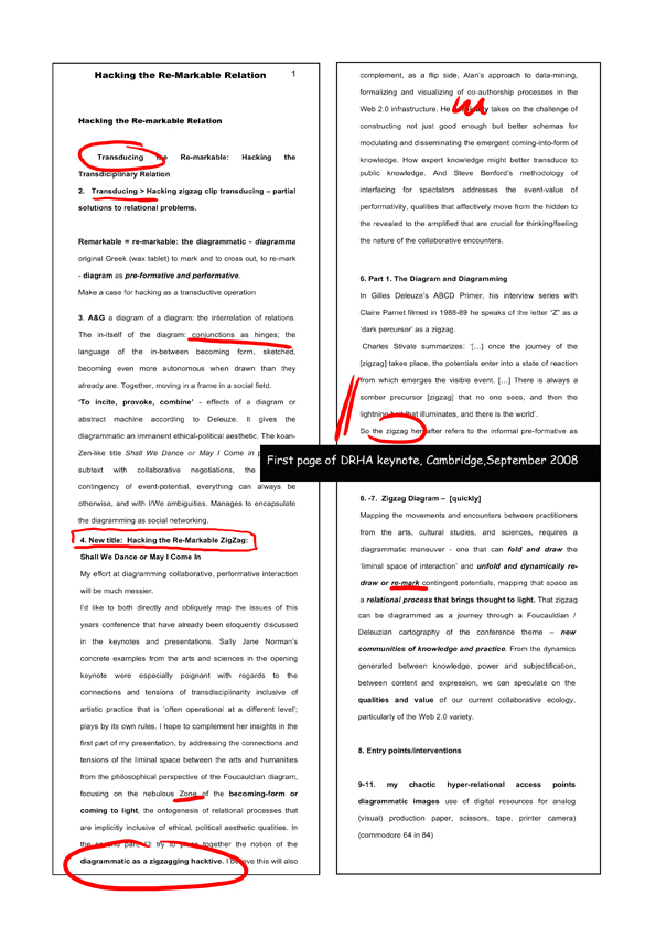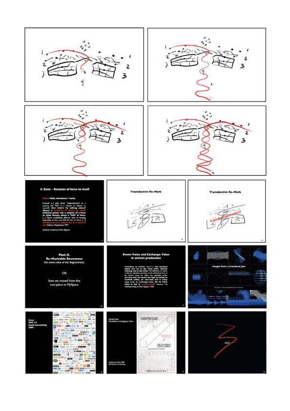 A new diagram was created for mapping the movement of thought for two paper invitations: a chapter on politics in Interfaces of Performance and a keynote address for the Digital Resources in the Humanities and Arts (DRHA) conference in Cambridge, September 2008 entitled Hacking the Re-markable Relation. Both texts are an extension of the process begun in Montreal. Presented here is a strip format of diagram details and the texts they generated.