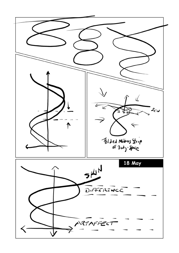 Diagrammatic Praxis was a post-doctoral research process drawing upon applied concepts of the diagram previously explored in my dissertation, ‘The Translocal Event and the Polyrhythmic Diagram.’ As a researcher in the Art, Research, Theory and Innovation (ARTI) lectoraat of the Amsterdam School for the Arts, the primary focus was on image/text relationality as a vehicle for investigating applied theoretical practice in artistic processes. I worked with Foucault’s concept of the diagram, rejuvenated by Deleuze as abstract machine and Massumi’s concept of the biogram. Thinking the diagram entails negotiating several registers of relations between forces immanent to a field of experience. A diagrammatic practice emphasizes movement with and through the dynamic intensities of an inter-disciplinary field, instantiating the commingled performativity of theory and artmaking through fielding. It experientially engages energetic transductions between unformed matter and unformalised function, between the discursive and the non-discursive, the visible and articulable, content and expression, chaos and order, catastrophe and rhythm. The research aims to contribute to emerging discourse on artistic research as experimental methods of reading and writing are interwoven with artmaking processes. Additionally, the current wave of discourse on vibrant materiality, object ontologies and thing theory resonate with collaborative, diagrammatic methods. Diagrammatic praxis is situated within interdisciplinary investigations of the collaborative dynamics of mattering. How, as Bruno Latour has pointed out, matters of fact emanate as matters of concern. How objects, things, performers and publics might generate the felt concerns of the event. This proposition of gathering, through an intricate mesh of mattering inclusive of things at all scales of experience, from quarks to cosmos, from facts to fictions excites what matters as the experience of the relational dynamics of the event and its emerging concerns. The material presented in JAR is a compilation of a fraction of the image and text elements from a three-year process, shaped as a graphic essay. Works include graphic translations, works on paper and published texts created from an integral diagrammatic method.