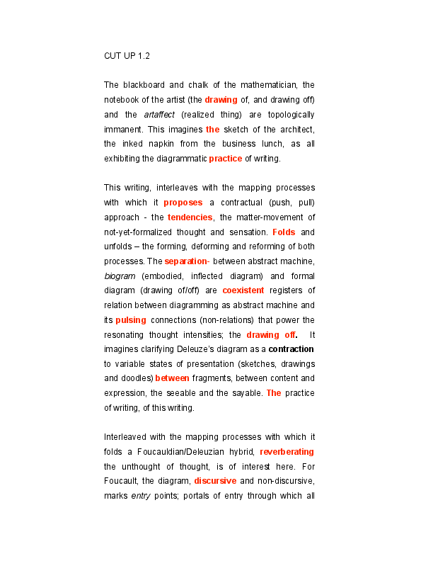Diagrammatic Praxis was a post-doctoral research process drawing upon applied concepts of the diagram previously explored in my dissertation, ‘The Translocal Event and the Polyrhythmic Diagram.’ As a researcher in the Art, Research, Theory and Innovation (ARTI) lectoraat of the Amsterdam School for the Arts, the primary focus was on image/text relationality as a vehicle for investigating applied theoretical practice in artistic processes. I worked with Foucault’s concept of the diagram, rejuvenated by Deleuze as abstract machine and Massumi’s concept of the biogram. Thinking the diagram entails negotiating several registers of relations between forces immanent to a field of experience. A diagrammatic practice emphasizes movement with and through the dynamic intensities of an inter-disciplinary field, instantiating the commingled performativity of theory and artmaking through fielding. It experientially engages energetic transductions between unformed matter and unformalised function, between the discursive and the non-discursive, the visible and articulable, content and expression, chaos and order, catastrophe and rhythm. The research aims to contribute to emerging discourse on artistic research as experimental methods of reading and writing are interwoven with artmaking processes. Additionally, the current wave of discourse on vibrant materiality, object ontologies and thing theory resonate with collaborative, diagrammatic methods. Diagrammatic praxis is situated within interdisciplinary investigations of the collaborative dynamics of mattering. How, as Bruno Latour has pointed out, matters of fact emanate as matters of concern. How objects, things, performers and publics might generate the felt concerns of the event. This proposition of gathering, through an intricate mesh of mattering inclusive of things at all scales of experience, from quarks to cosmos, from facts to fictions excites what matters as the experience of the relational dynamics of the event and its emerging concerns. The material presented in JAR is a compilation of a fraction of the image and text elements from a three-year process, shaped as a graphic essay. Works include graphic translations, works on paper and published texts created from an integral diagrammatic method.