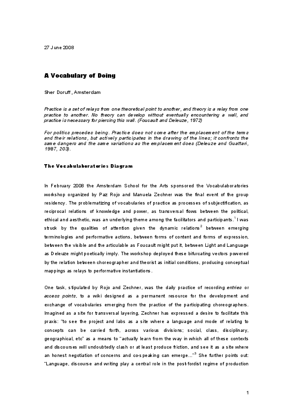 Diagrammatic Praxis was a post-doctoral research process drawing upon applied concepts of the diagram previously explored in my dissertation, ‘The Translocal Event and the Polyrhythmic Diagram.’ As a researcher in the Art, Research, Theory and Innovation (ARTI) lectoraat of the Amsterdam School for the Arts, the primary focus was on image/text relationality as a vehicle for investigating applied theoretical practice in artistic processes. I worked with Foucault’s concept of the diagram, rejuvenated by Deleuze as abstract machine and Massumi’s concept of the biogram. Thinking the diagram entails negotiating several registers of relations between forces immanent to a field of experience. A diagrammatic practice emphasizes movement with and through the dynamic intensities of an inter-disciplinary field, instantiating the commingled performativity of theory and artmaking through fielding. It experientially engages energetic transductions between unformed matter and unformalised function, between the discursive and the non-discursive, the visible and articulable, content and expression, chaos and order, catastrophe and rhythm. The research aims to contribute to emerging discourse on artistic research as experimental methods of reading and writing are interwoven with artmaking processes. Additionally, the current wave of discourse on vibrant materiality, object ontologies and thing theory resonate with collaborative, diagrammatic methods. Diagrammatic praxis is situated within interdisciplinary investigations of the collaborative dynamics of mattering. How, as Bruno Latour has pointed out, matters of fact emanate as matters of concern. How objects, things, performers and publics might generate the felt concerns of the event. This proposition of gathering, through an intricate mesh of mattering inclusive of things at all scales of experience, from quarks to cosmos, from facts to fictions excites what matters as the experience of the relational dynamics of the event and its emerging concerns. The material presented in JAR is a compilation of a fraction of the image and text elements from a three-year process, shaped as a graphic essay. Works include graphic translations, works on paper and published texts created from an integral diagrammatic method.