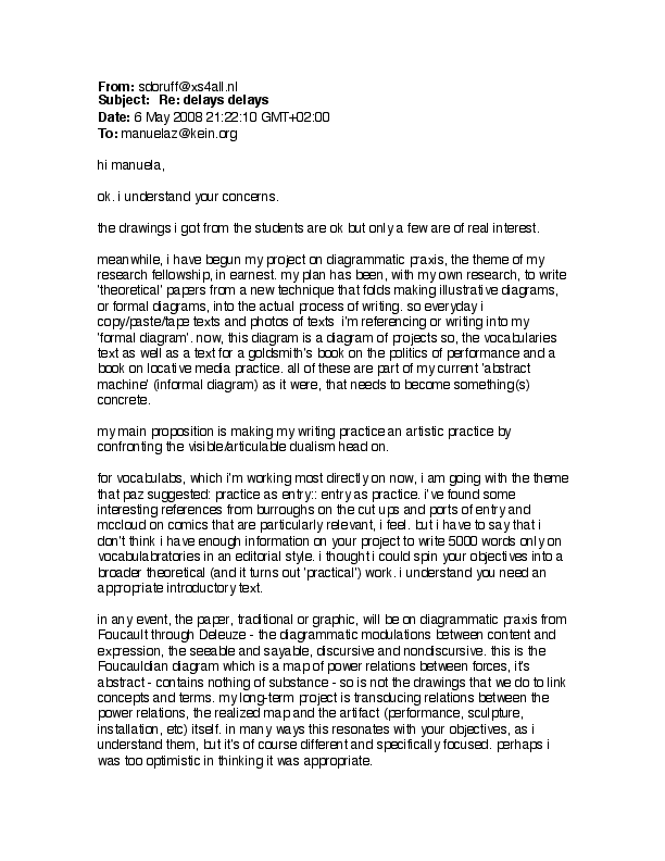 Diagrammatic Praxis was a post-doctoral research process drawing upon applied concepts of the diagram previously explored in my dissertation, ‘The Translocal Event and the Polyrhythmic Diagram.’ As a researcher in the Art, Research, Theory and Innovation (ARTI) lectoraat of the Amsterdam School for the Arts, the primary focus was on image/text relationality as a vehicle for investigating applied theoretical practice in artistic processes. I worked with Foucault’s concept of the diagram, rejuvenated by Deleuze as abstract machine and Massumi’s concept of the biogram. Thinking the diagram entails negotiating several registers of relations between forces immanent to a field of experience. A diagrammatic practice emphasizes movement with and through the dynamic intensities of an inter-disciplinary field, instantiating the commingled performativity of theory and artmaking through fielding. It experientially engages energetic transductions between unformed matter and unformalised function, between the discursive and the non-discursive, the visible and articulable, content and expression, chaos and order, catastrophe and rhythm. The research aims to contribute to emerging discourse on artistic research as experimental methods of reading and writing are interwoven with artmaking processes. Additionally, the current wave of discourse on vibrant materiality, object ontologies and thing theory resonate with collaborative, diagrammatic methods. Diagrammatic praxis is situated within interdisciplinary investigations of the collaborative dynamics of mattering. How, as Bruno Latour has pointed out, matters of fact emanate as matters of concern. How objects, things, performers and publics might generate the felt concerns of the event. This proposition of gathering, through an intricate mesh of mattering inclusive of things at all scales of experience, from quarks to cosmos, from facts to fictions excites what matters as the experience of the relational dynamics of the event and its emerging concerns. The material presented in JAR is a compilation of a fraction of the image and text elements from a three-year process, shaped as a graphic essay. Works include graphic translations, works on paper and published texts created from an integral diagrammatic method.