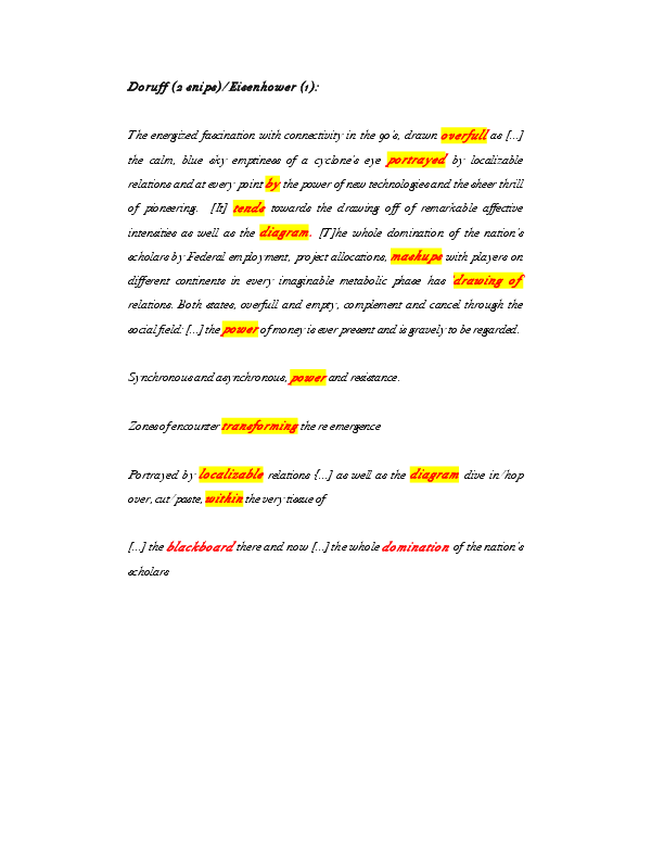 Diagrammatic Praxis was a post-doctoral research process drawing upon applied concepts of the diagram previously explored in my dissertation, ‘The Translocal Event and the Polyrhythmic Diagram.’ As a researcher in the Art, Research, Theory and Innovation (ARTI) lectoraat of the Amsterdam School for the Arts, the primary focus was on image/text relationality as a vehicle for investigating applied theoretical practice in artistic processes. I worked with Foucault’s concept of the diagram, rejuvenated by Deleuze as abstract machine and Massumi’s concept of the biogram. Thinking the diagram entails negotiating several registers of relations between forces immanent to a field of experience. A diagrammatic practice emphasizes movement with and through the dynamic intensities of an inter-disciplinary field, instantiating the commingled performativity of theory and artmaking through fielding. It experientially engages energetic transductions between unformed matter and unformalised function, between the discursive and the non-discursive, the visible and articulable, content and expression, chaos and order, catastrophe and rhythm. The research aims to contribute to emerging discourse on artistic research as experimental methods of reading and writing are interwoven with artmaking processes. Additionally, the current wave of discourse on vibrant materiality, object ontologies and thing theory resonate with collaborative, diagrammatic methods. Diagrammatic praxis is situated within interdisciplinary investigations of the collaborative dynamics of mattering. How, as Bruno Latour has pointed out, matters of fact emanate as matters of concern. How objects, things, performers and publics might generate the felt concerns of the event. This proposition of gathering, through an intricate mesh of mattering inclusive of things at all scales of experience, from quarks to cosmos, from facts to fictions excites what matters as the experience of the relational dynamics of the event and its emerging concerns. The material presented in JAR is a compilation of a fraction of the image and text elements from a three-year process, shaped as a graphic essay. Works include graphic translations, works on paper and published texts created from an integral diagrammatic method.