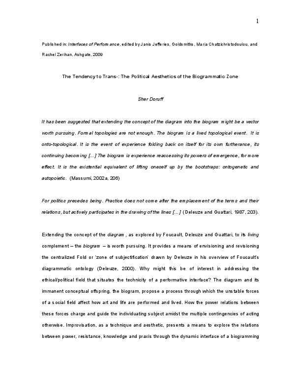 Diagrammatic Praxis was a post-doctoral research process drawing upon applied concepts of the diagram previously explored in my dissertation, ‘The Translocal Event and the Polyrhythmic Diagram.’ As a researcher in the Art, Research, Theory and Innovation (ARTI) lectoraat of the Amsterdam School for the Arts, the primary focus was on image/text relationality as a vehicle for investigating applied theoretical practice in artistic processes. I worked with Foucault’s concept of the diagram, rejuvenated by Deleuze as abstract machine and Massumi’s concept of the biogram. Thinking the diagram entails negotiating several registers of relations between forces immanent to a field of experience. A diagrammatic practice emphasizes movement with and through the dynamic intensities of an inter-disciplinary field, instantiating the commingled performativity of theory and artmaking through fielding. It experientially engages energetic transductions between unformed matter and unformalised function, between the discursive and the non-discursive, the visible and articulable, content and expression, chaos and order, catastrophe and rhythm. The research aims to contribute to emerging discourse on artistic research as experimental methods of reading and writing are interwoven with artmaking processes. Additionally, the current wave of discourse on vibrant materiality, object ontologies and thing theory resonate with collaborative, diagrammatic methods. Diagrammatic praxis is situated within interdisciplinary investigations of the collaborative dynamics of mattering. How, as Bruno Latour has pointed out, matters of fact emanate as matters of concern. How objects, things, performers and publics might generate the felt concerns of the event. This proposition of gathering, through an intricate mesh of mattering inclusive of things at all scales of experience, from quarks to cosmos, from facts to fictions excites what matters as the experience of the relational dynamics of the event and its emerging concerns. The material presented in JAR is a compilation of a fraction of the image and text elements from a three-year process, shaped as a graphic essay. Works include graphic translations, works on paper and published texts created from an integral diagrammatic method.