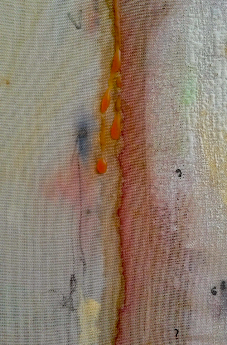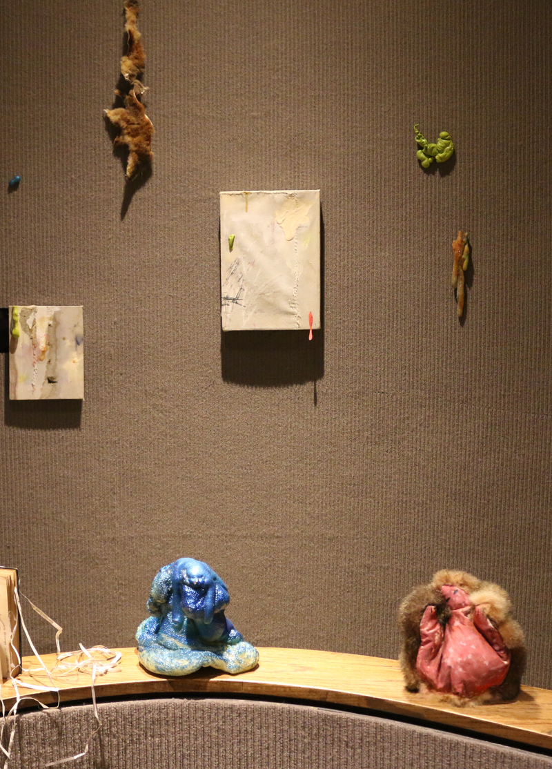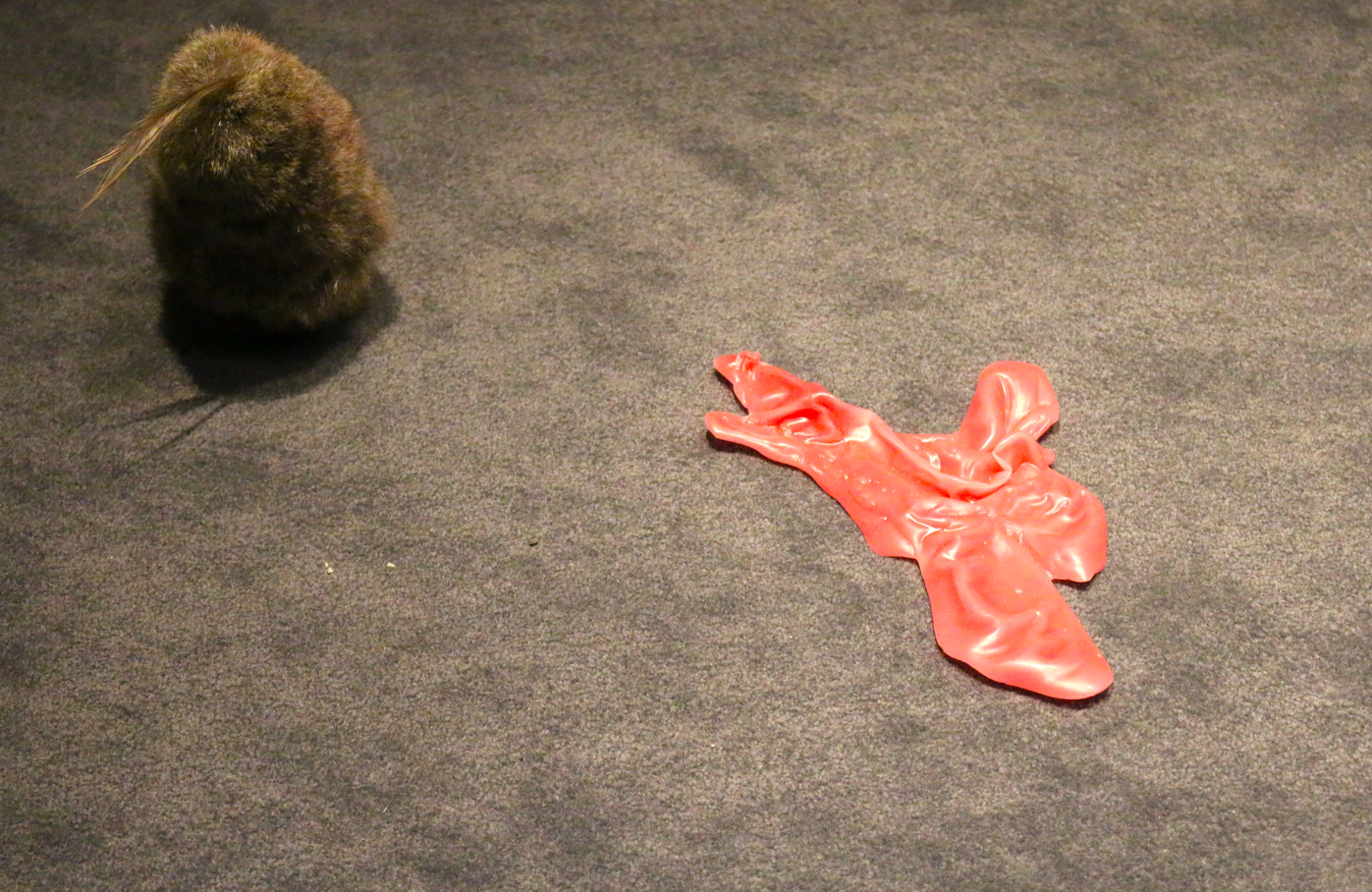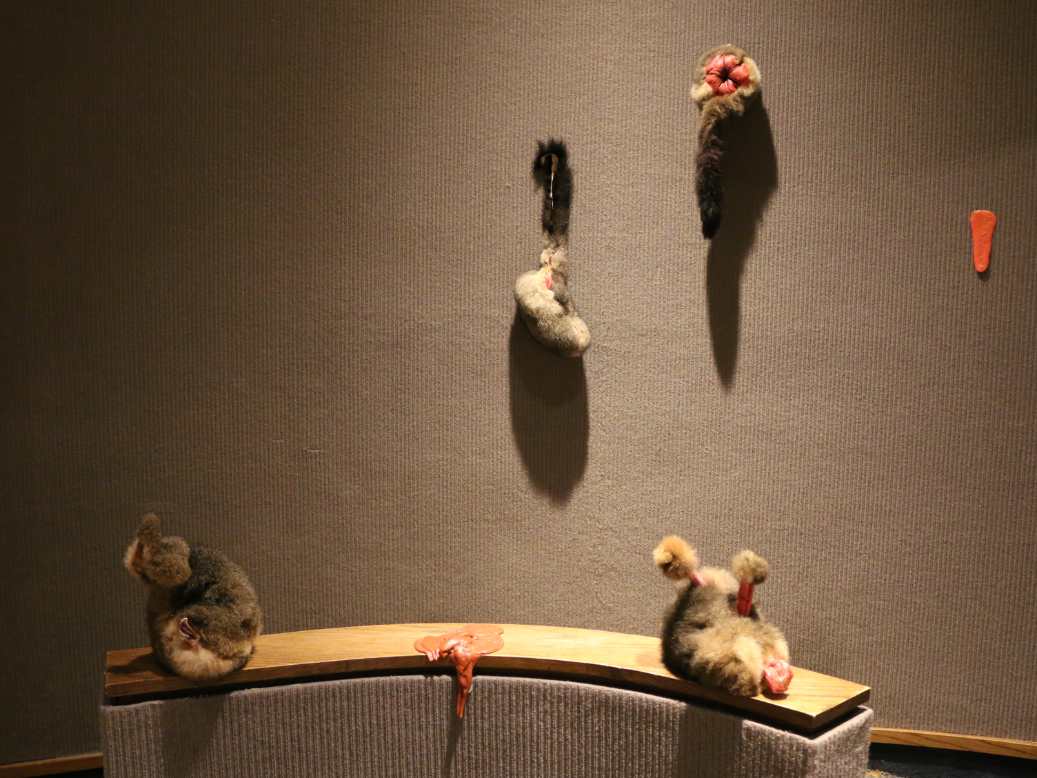 The artworks negotiate abjection through their material forms, as well as their artmaking processes and spaces of encounter with the work, rather than representing the abject, literally or metaphorically, as has previously been the case by visual artists.[2] MacGuire's work includes possum skin, naturally sourced ochre pigment and bodily fluids that are culturally significant in Indigenous heritage but considered to be taboo and other to normative cultural protocols. For Taylor, this includes paint comprising pigment mixed with mediums such as wax, vinyl and polyurethane, and text as the painted mark, which rupture dominant structures and conventions that consitute 'text' and 'painting'. The researchers also devised and put into practice new curatorial strategies that 'queered' the exhibition space by disrupting normative modalities of 'reading’, 'viewing’ and ‘looking’ aligned with ocularcentrism and the symbolic. By reconceiving the gallery space as a generative site of process and subjective exchange as underpinned by Taylor's concept of intermateriality, the viewer is actively engaged in the meaning-making process through their own intersubjective experience and encounter as a continual process related to différance.