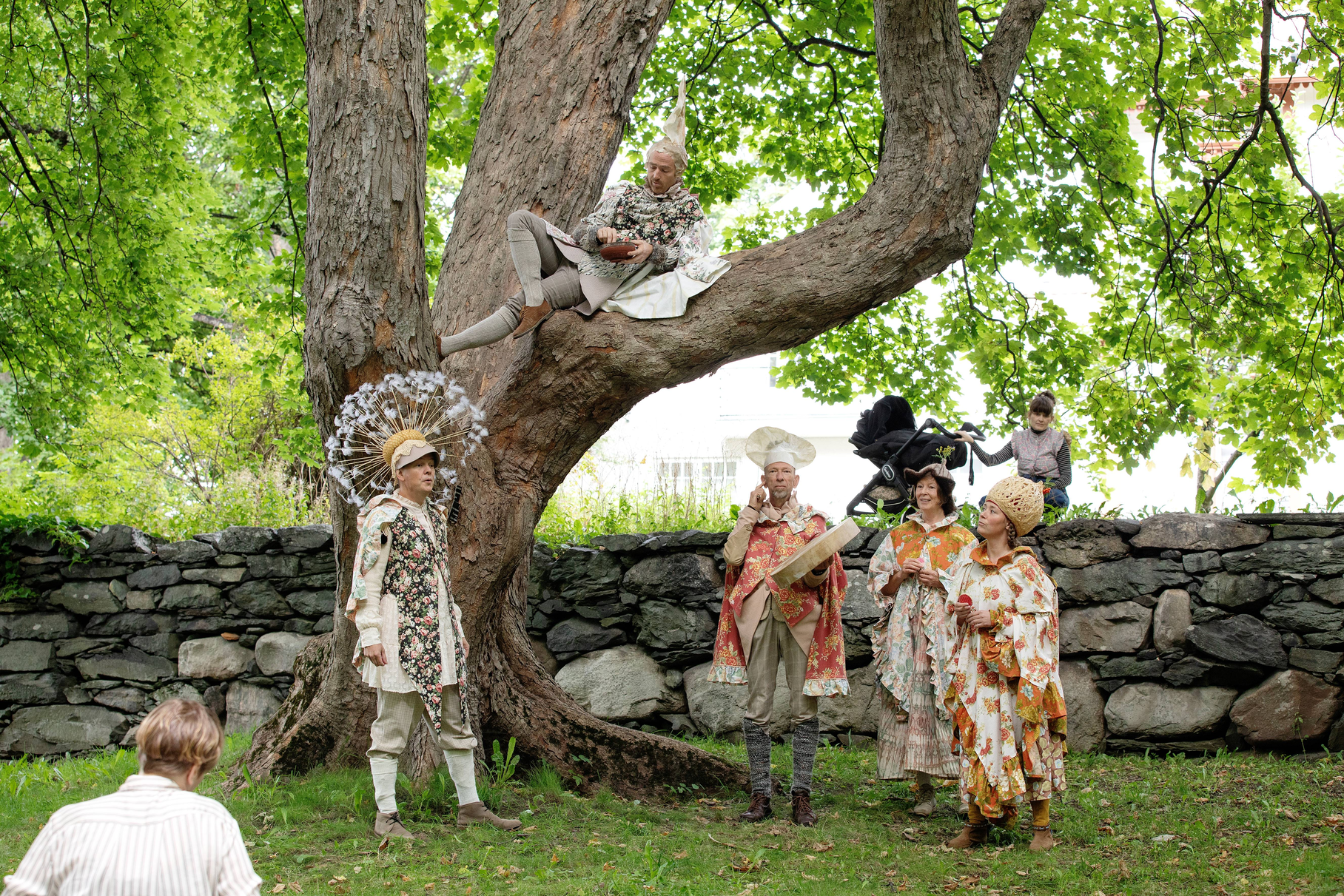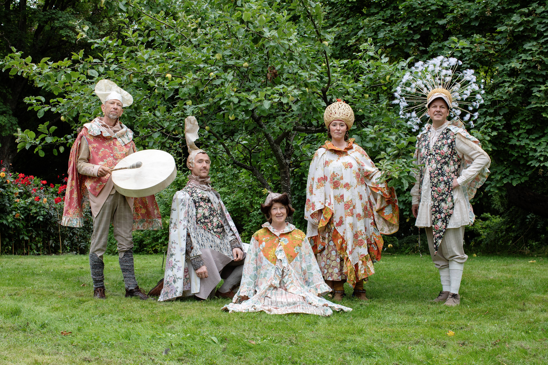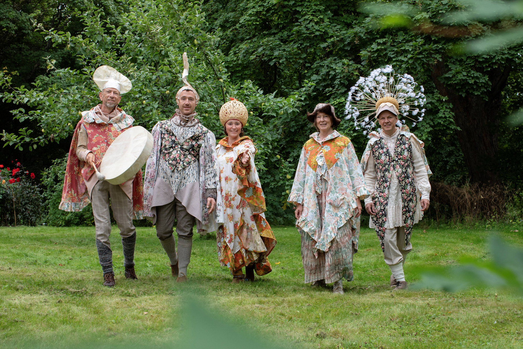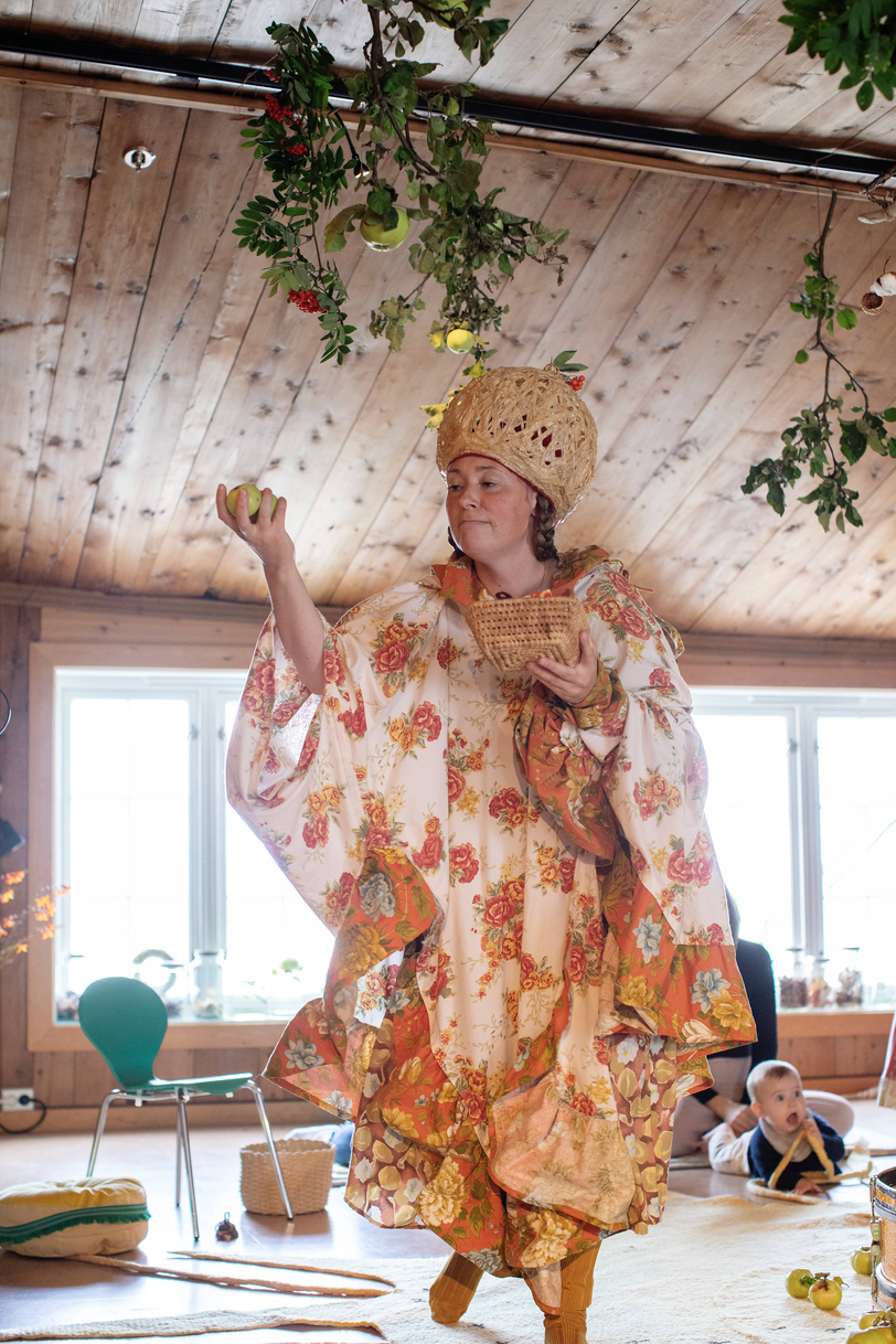 Summer Seeds was played late in the summer, on September 1st and 2nd. Up in the largest maple tree in the garden, LønneLars sat and sang until the green foliage trembled. Maple seeds spun down from the gigantic treetop, like small helicopters descending for landing. Inspired by the spinning of the maple seeds, we whirled like summer seeds towards the garden nymph Pomona, the protector of apples, who for the occasion had been given both a light summer dress and a bright yellow sun that she holds up with her hands. We greeted the summer-dressed Pomona with song and dance, before the seeds whirled on up the stairs to the apple tree.